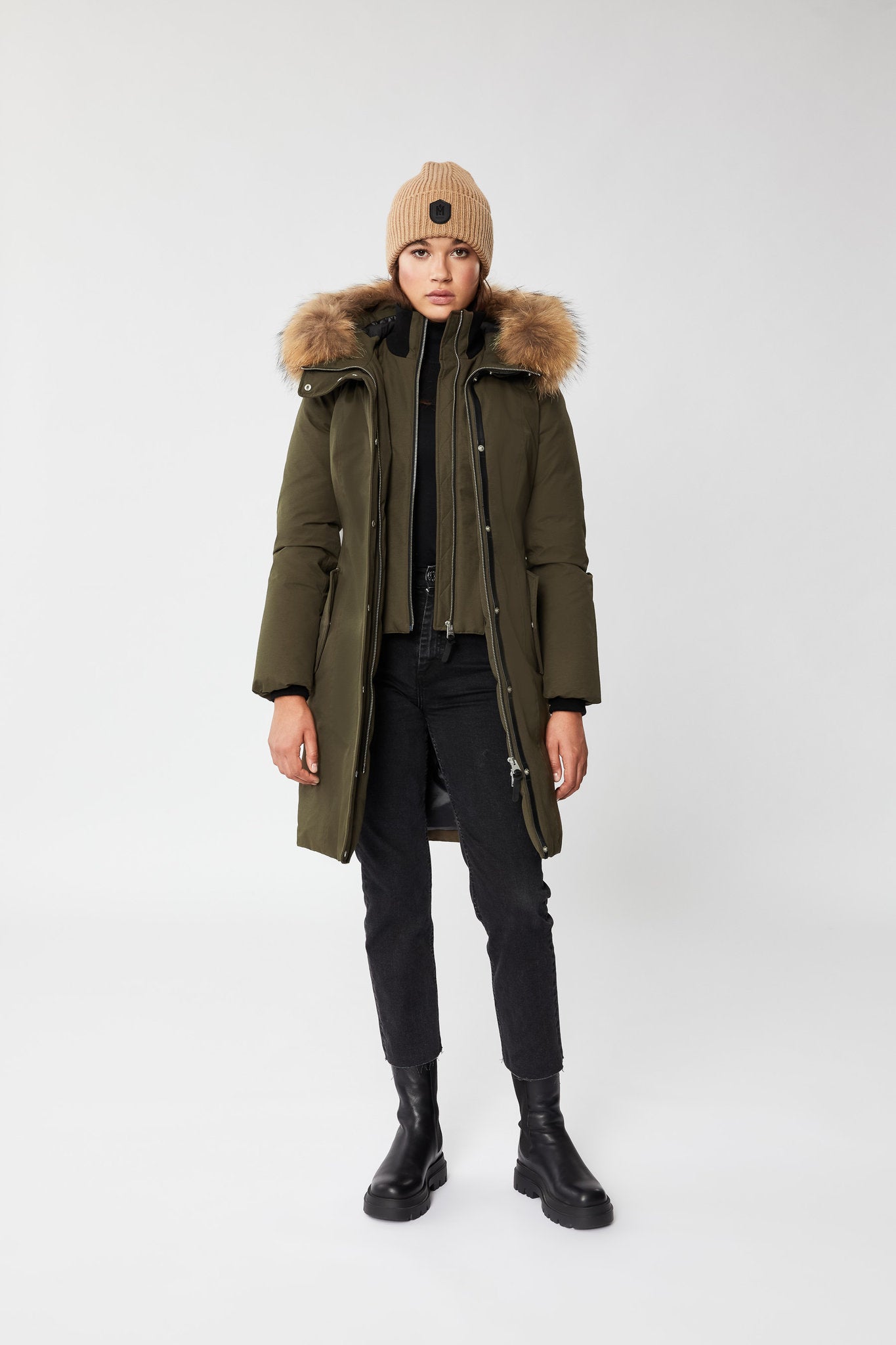 The Women’s HARLOWE-R Jacket by MACKAGE is a fitted down coat with a hood and a removable natural fur trim. It uses 800+ nano down fill power that holds up in temperatures as low as -25°C. The jacket is water-repellent, windproof and breathable, and features a removable bib with a ribbed collar for a versatile style. Additional features include ribbed storm cuffs, fleece-lined pockets and leather trim at the zipper for complete winter functionality in stylish parka form.