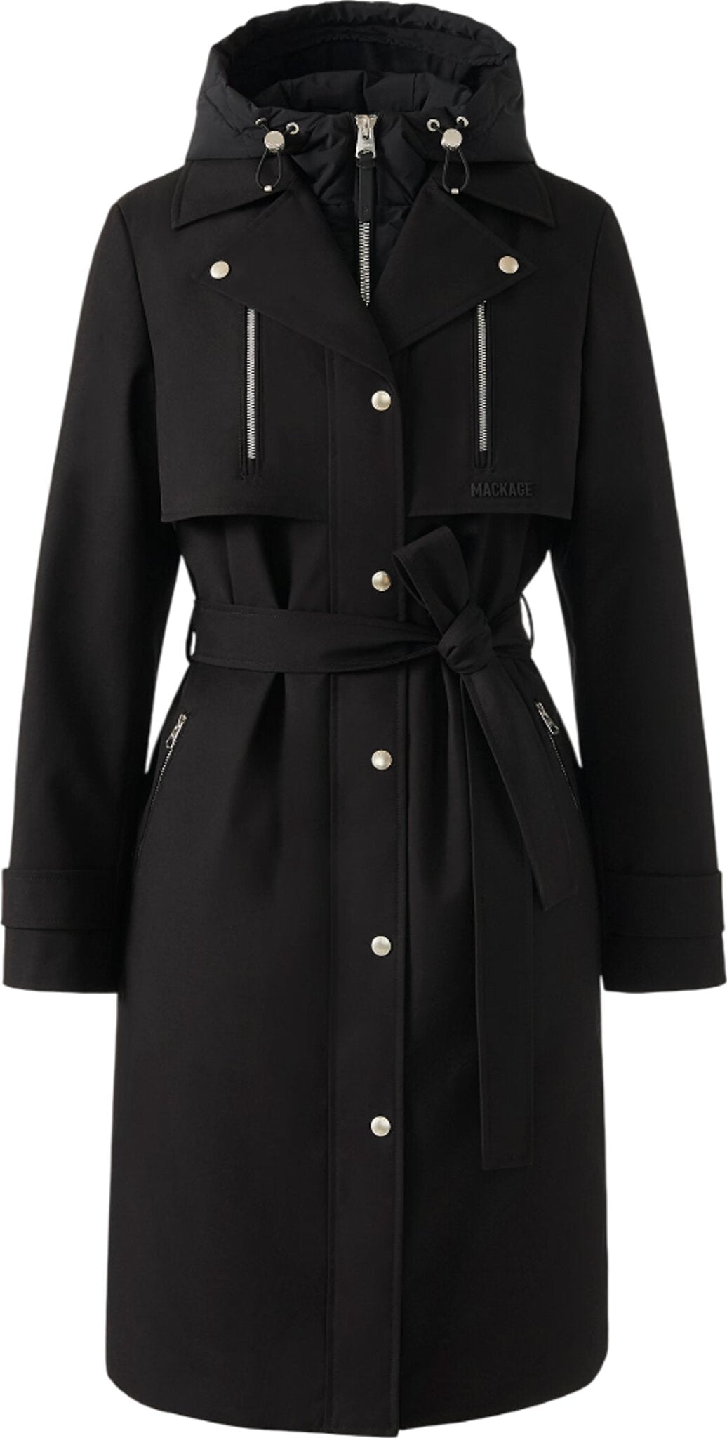 SIOBHAN is a long feather down-filled trench coat engineered for functional warmth and transitional wear. Designed in recycled stretch material, it features a removable lightweight down bib, storm visor, and a regular-cut silhouette enhanced by a sash belt. The high-performance shell is water-repellent and windproof, while zippered pockets and underarm vents offer everyday versatility. Designed for elevated style with technical comfort.
