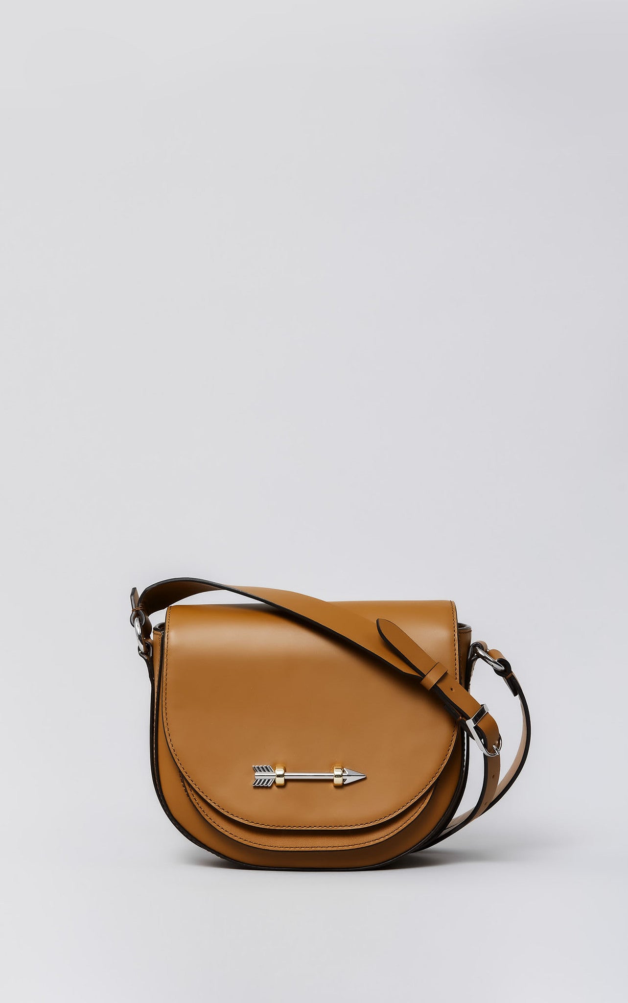 Sion by Mackage is a saddle-style calfskin bag with a shoulder strap pocket, layered under-flap pockets and Mackage’s signature arrow closure.