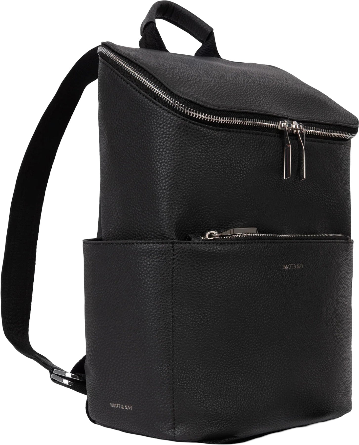 Backpack with top zipper closure. Adjustable webbing straps. Side pockets and front zipper pocket. Fits a 13” laptop.