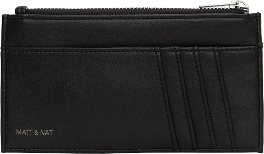 Wallet with top zipper closure, slip pocket and 4 card slots on the front and 2 card slots on the back.