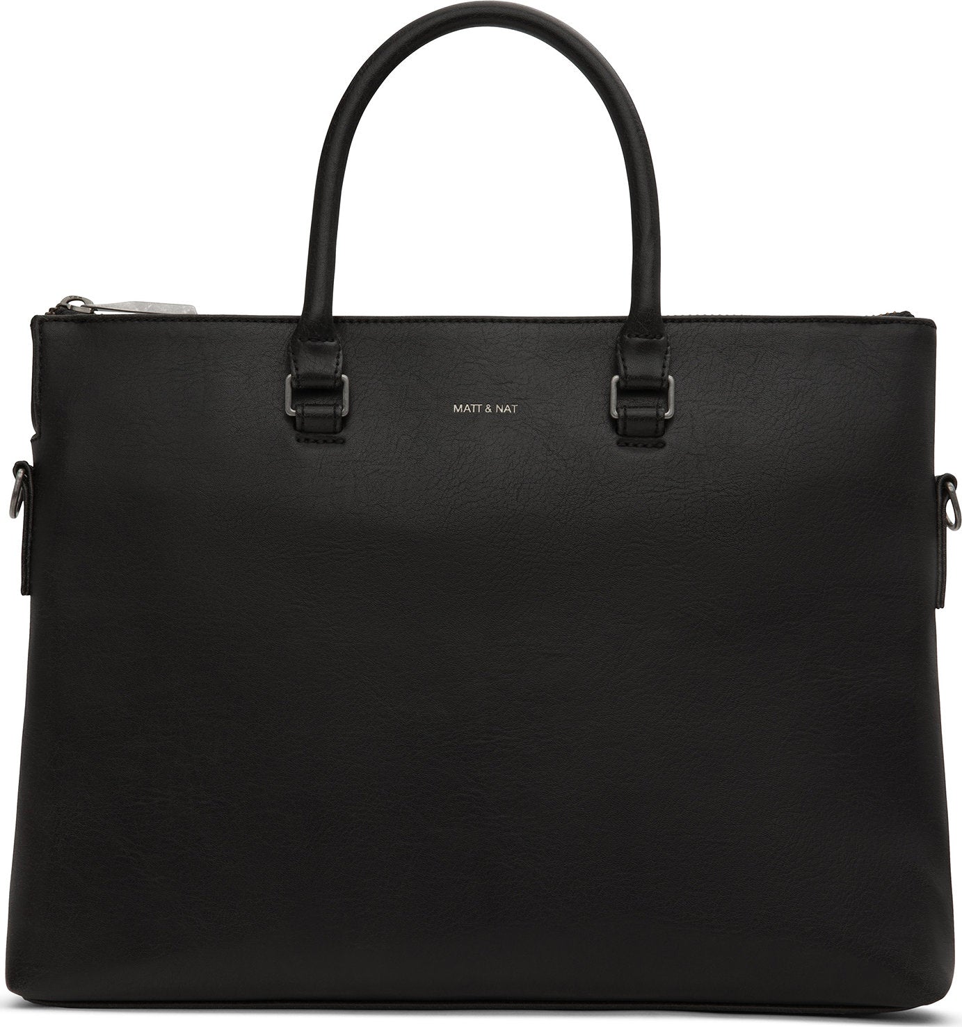 Briefcase with metal zip closure at top. Front slip compartment with magnetic snap closure. Tubular handles with square rings. Comes with a removable and adjustable crossbody strap with standard shoulder patch. Fits a 13” laptop.