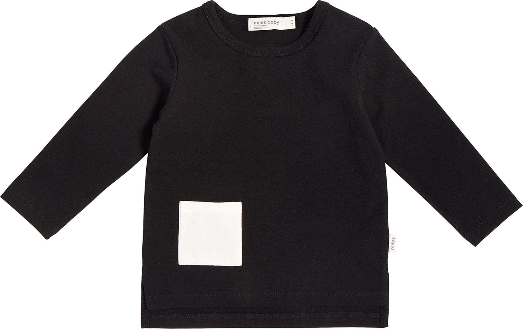 The perfect long-sleeve shirt in solid black. The contrasting pocket and lower side placement is a Miles twist on a timeless style. It is made from a super soft jersey in organically grown cotton with added spandex for stretch and durability. The ribbed neckline makes for easy over the head changes. Mix and Miles with our joggers for endless outfit combos.