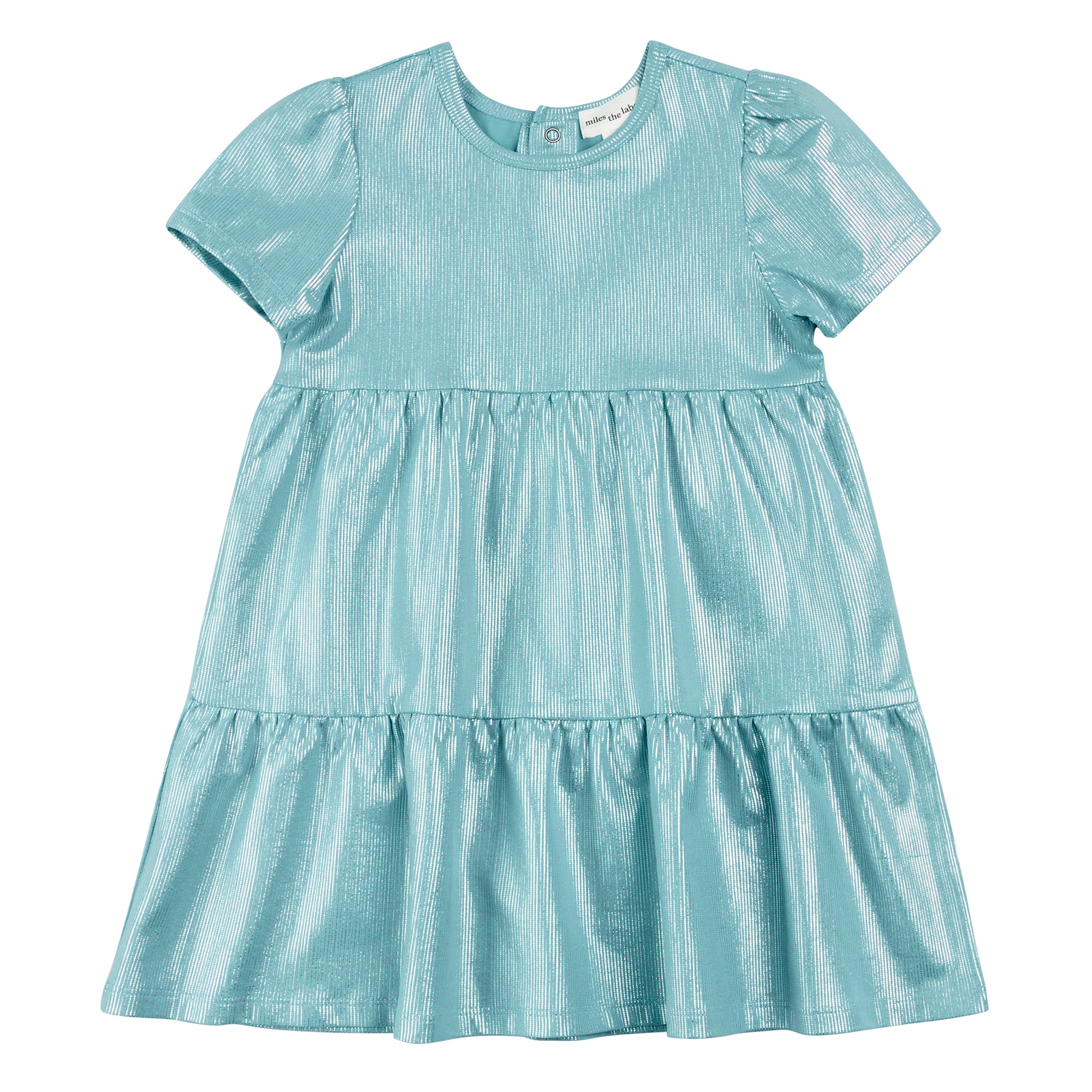 This tiered dress is sweet, flattering and perfect for twirling spring days away. Made from organically grown cotton lame jersey, the dress has a shiny finish that will have her feeling her best. A button placket at the back helps with over-the-head dressing and keeps the front looking neat. Whether adding a little fun to every day, or heading to a party, this easy-wearing dress will be her top choice every time.