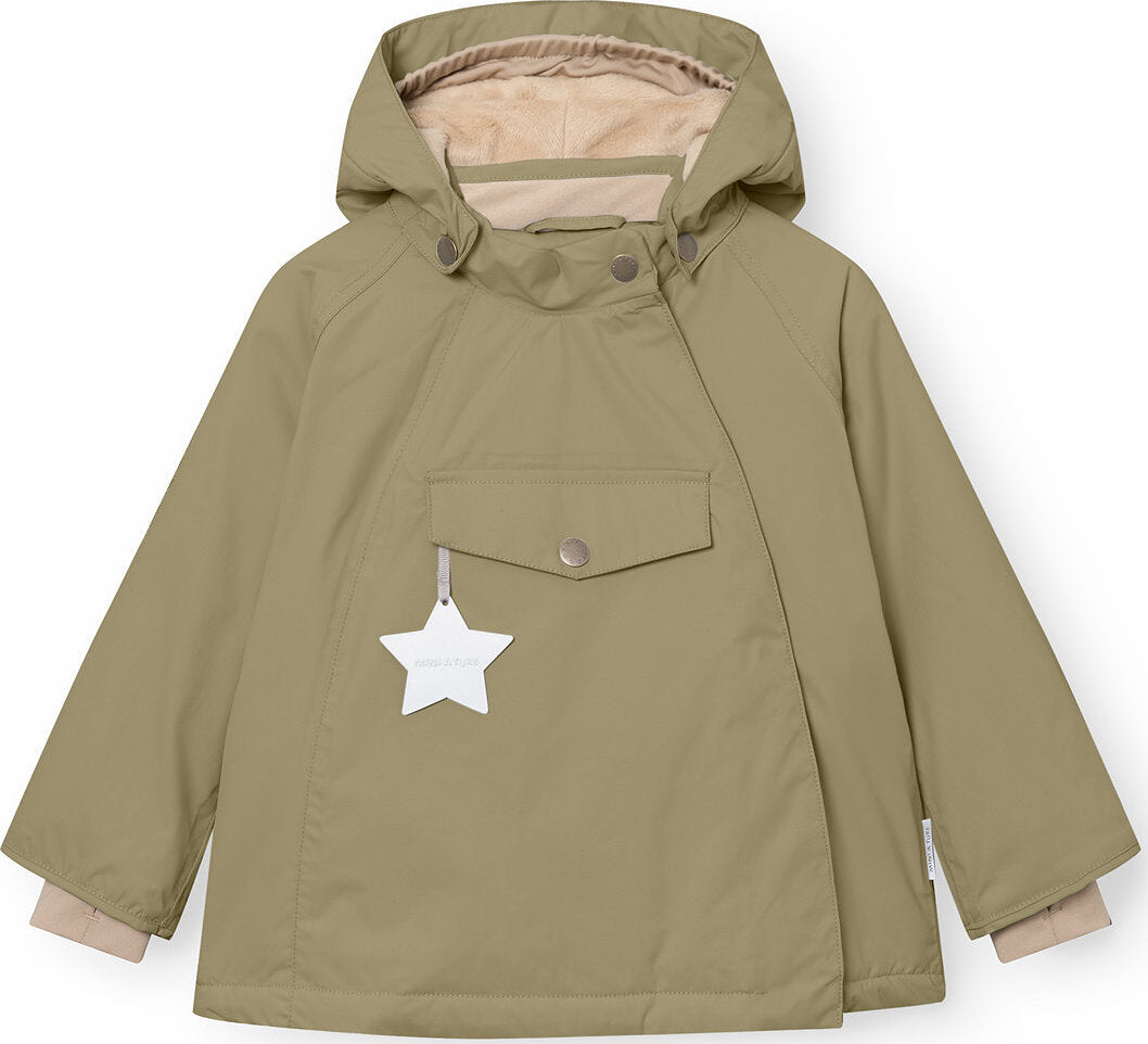 Wind-and waterproof, breathable, and tested to keep warm down to -25 degrees Celsius. The jacket opens at the front by a hidden, slanted zipper and has a soft fleece lining. Featuring a detachable hood that can be adjusted with an elastic string to keep the wind out. The sleeves have improved fitting, securing the freedom to move as well as snow cuffs at the wrists with thumb opening. The waist is adjustable from the inside with an elastic. Sizes up to and including 86cm/18m have a rib around the neck, while the larger sizes have a regular collar. Mini A Ture signature reflex star in the front pocket.
