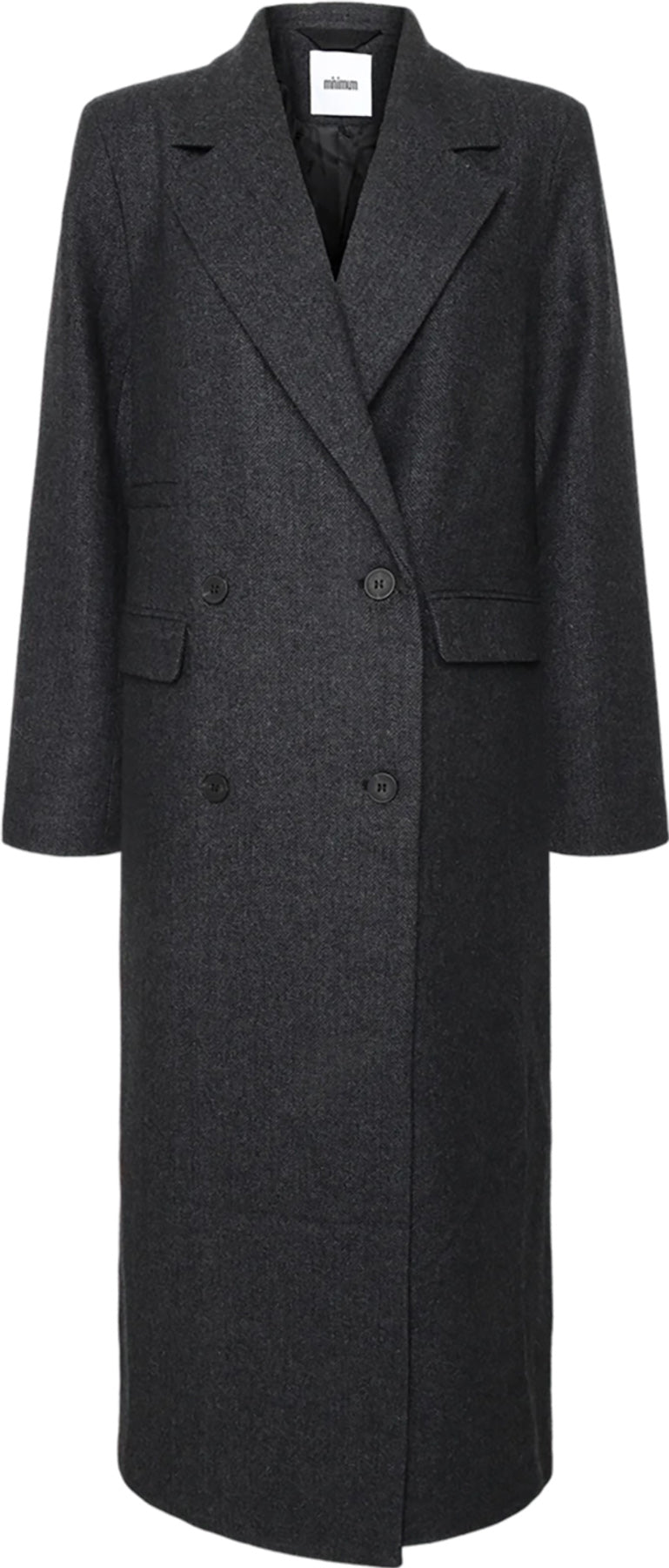 Delphines is a double breasted wool coat made from 50% wool and 50% polyester for a warm and comfortable quality. The coat is slightly oversized and features a lov neckline with a lapel collar, two side pockets and a slit in the back.
