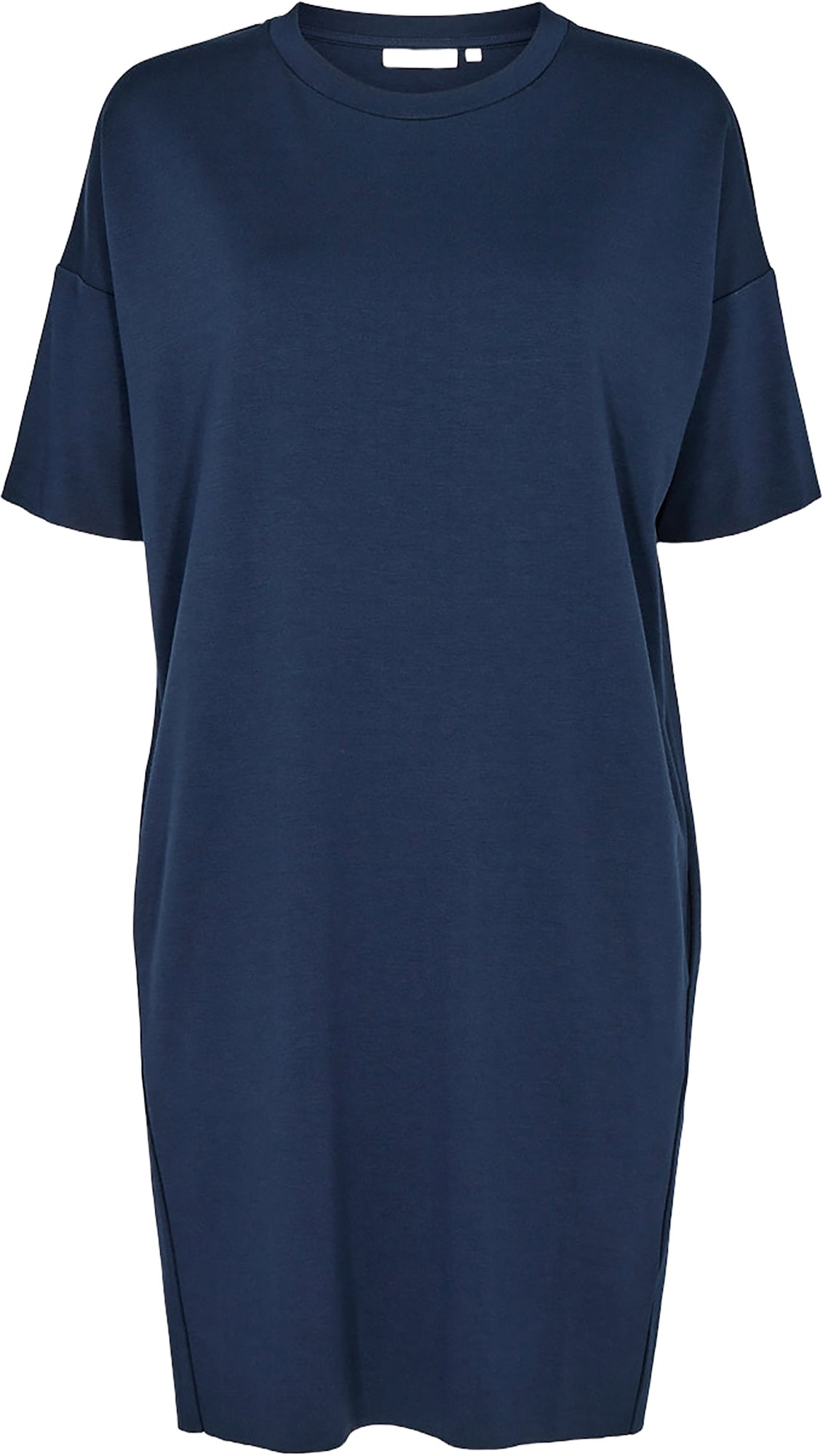 The Regitza 2.0 0265 is a T-shirt dress, crafted from a viscose and recycled polyester blend with stretch. The dress is designed with a cocoon shape, an above knee-length, dropped shoulders, crew neck, slant pockets and minimalistic laser-cut hems.