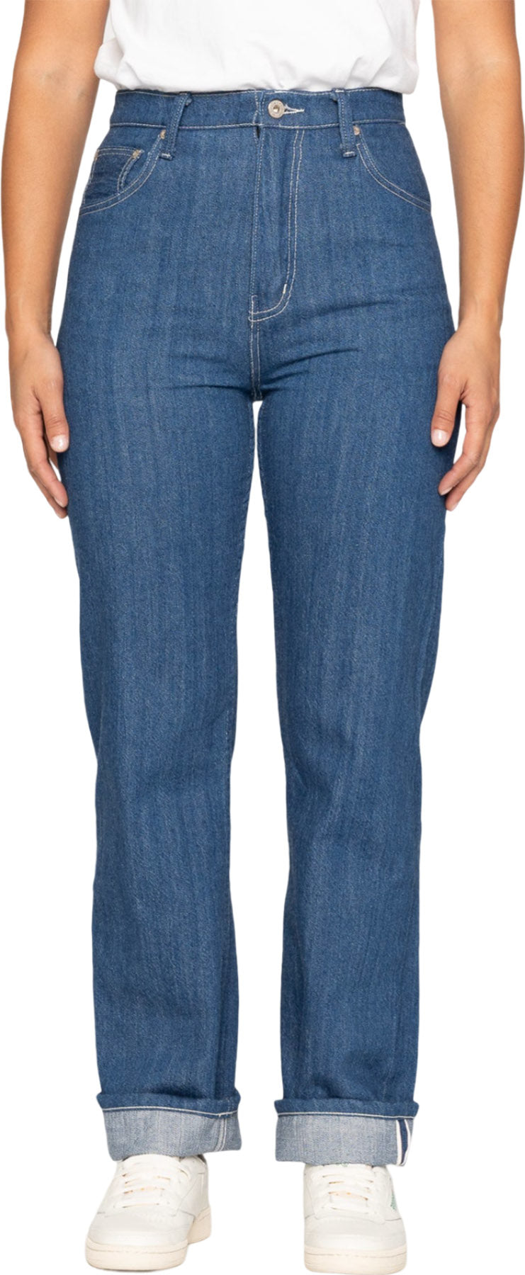 The High Noon Selvedge is a 10oz lightweight Japanese Selvedge Denim, expertly woven on vintage shuttle looms in Okayama, Japan. It is unsanforized to preserve authenticity, giving it a characteristic leg twist. The denim sports a warm, mid-toned indigo hue, reminiscent of vintage pieces, and is highlighted with a classic red line selvedge ID. Designed for immediate comfort, the High Noon Selvedge is lightweight and soft, requiring no break-in period. Proudly crafted in Canada, these jeans feature contrast stitching, zip fly, a dark brown leather patch, and silver metallic hardware. The True Girl is a high-rise straight fit, fitted around the hips, fuller in the thigh that falls to a wide leg opening.