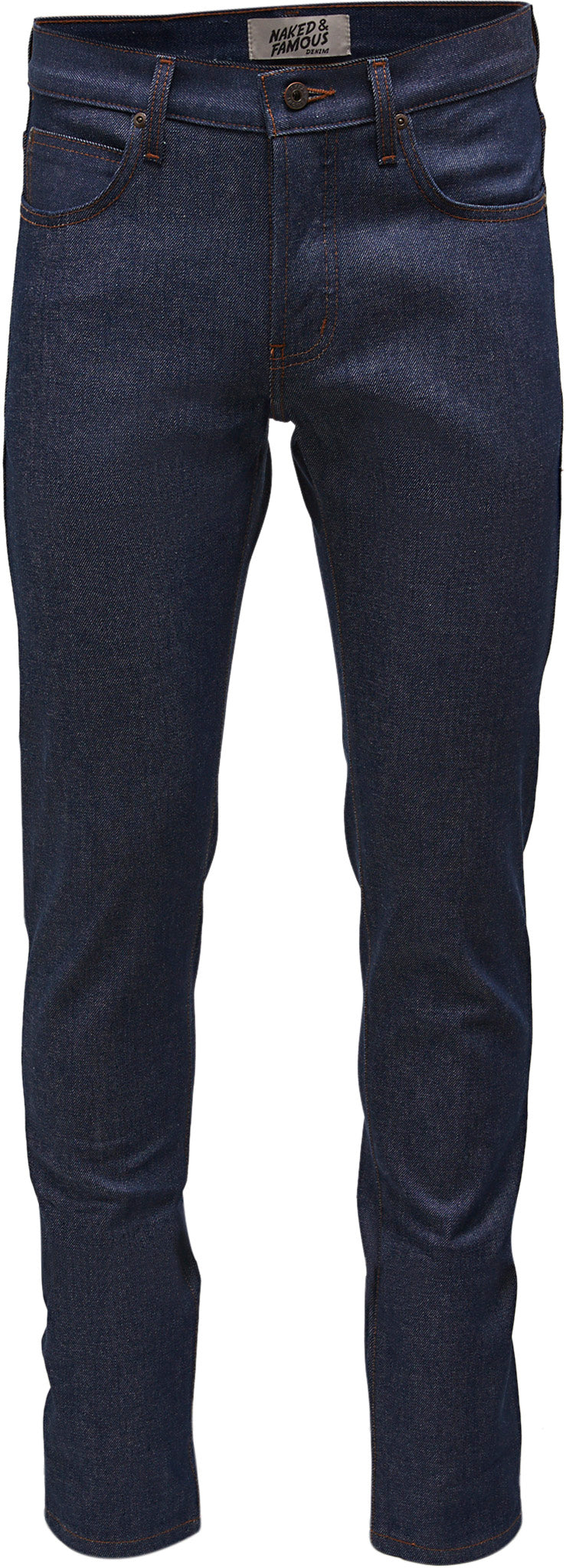 The Natural Indigo Selvedge is a 12.5oz indigo rope dyed Japanese selvedge denim, woven on vintage shuttle looms in a right hand twill construction. Natural indigo dye derived from fermenting the indigofera plant is used to create the mid blue color tone of these jeans. Other details include contrast stitching, full grain English tan leather patch, blue selvedge ID, dark copper buttons and rivets.