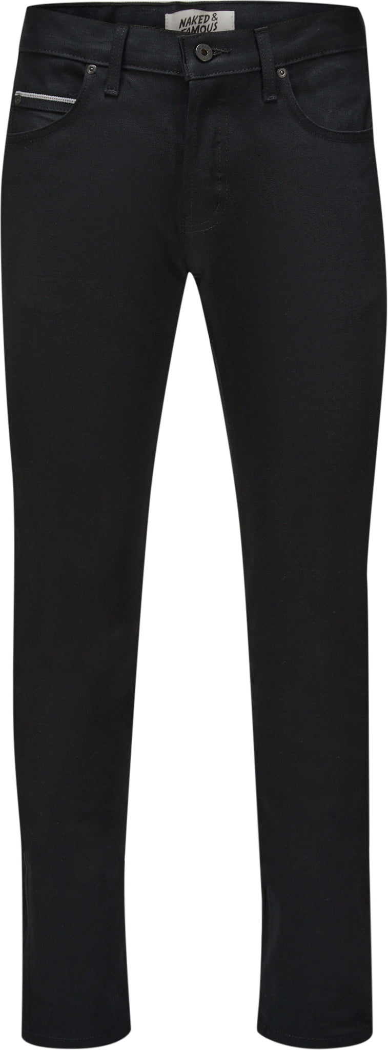 The Super Guy is a tapered skinny fit, fitted from the waist to thigh and tapered from the knee to hem to a super slim leg opening. The Black Cobra Stretch Selvedge is a 12oz Japanese selvedge denim made using 2% stretch for added comfort and improved break in time. Both the exterior warp and interior weft yarns are dyed black resulting in a pure black denim. Other details include classic red line selvedge ID, black tonal stitching, black leather patch, black military spec non reflective buttons and rivets.
