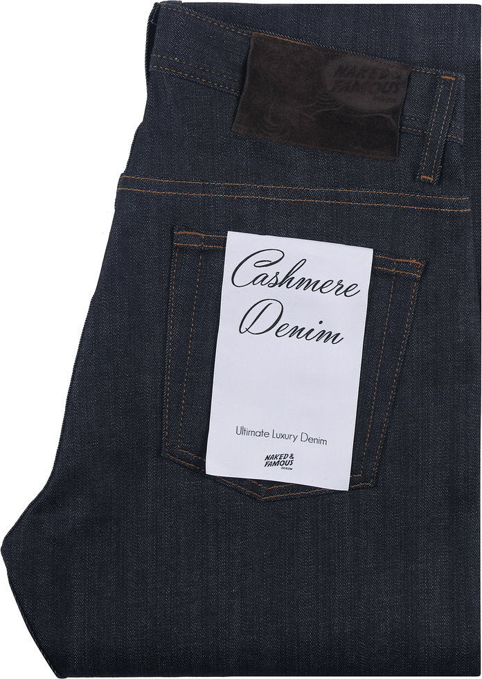 The Weird Guy is our standard tapered fit, comfortable from waist to hip and tapered from the knee to hem. The Cashmere Denim, is a 12oz Japanese denim made from a blend of cotton, 2% stretch, and 10% cashmere. The brushed interior feels amazing on your skin. Super soft and comfortable, yet durable with the clean look of raw denim. Finished with a luxurious suede leather patch.