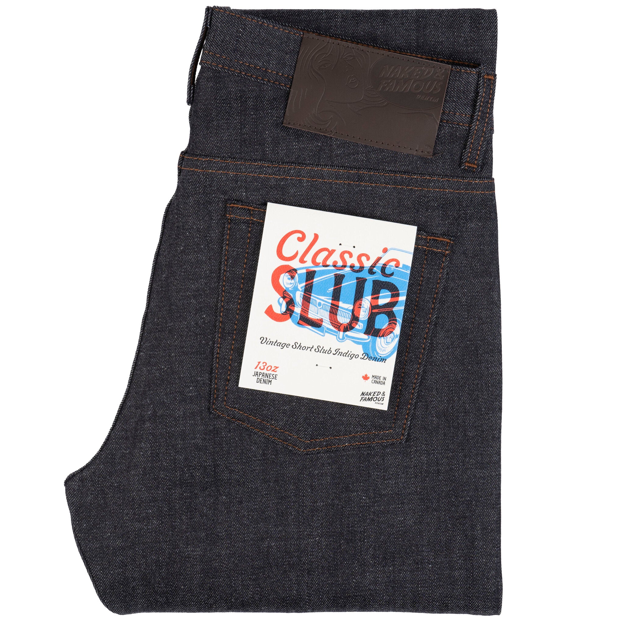 The Classic Slub is a 13oz Japanese Denim in a right-hand twill construction. The denim made using uneven “slub yarns” which creates an uneven streaky toned denim that produces high contrast vertical fade patterns with wear. Cut, sewn, built in Canada using contrast stitching, brown full grain leather patch, and dark copper buttons and rivets. The Weird Guy is a standard tapered fit with a medium rise, a comfortable top block, and a taper from knee to hem.