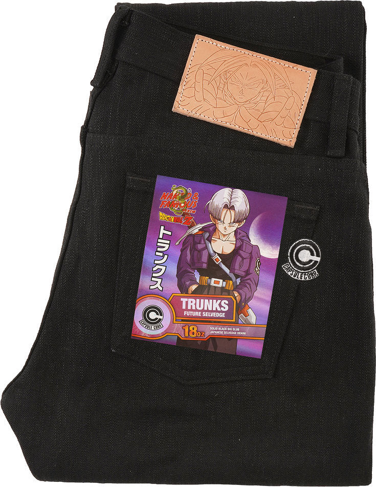 The Weird Guy is our standard tapered fit, comfortable from waist to hip and tapered from the knee to hem. The Dragon Ball Z x Naked & Famous Denim: Trunks Future Selvedge denim jeans are made from a custom developed 18oz Japanese selvedge denim. This heavyweight denim features a purple selvedge ID and an incredibly uneven slubby texture, a result of low tension weaving methods combined with the use of bumpy slub yarns. The denim dyed black on both the interior weft yarns and exterior warp yarns, creating an all-black look reminiscent of the characters own trousers. The natural vegetable tan leather patch features a Future Trunks in an electrifying action pose. Embroidered on the back pocket you'll find the 'Capsule Core' insignia. Hidden inside the jeans you'll find the Dragon Ball Z x Naked & Famous Denim dual branded logo, black pocket bags printed with a portrait of Future Trunks, and finished off with a copper Dragon Ball waist button.
