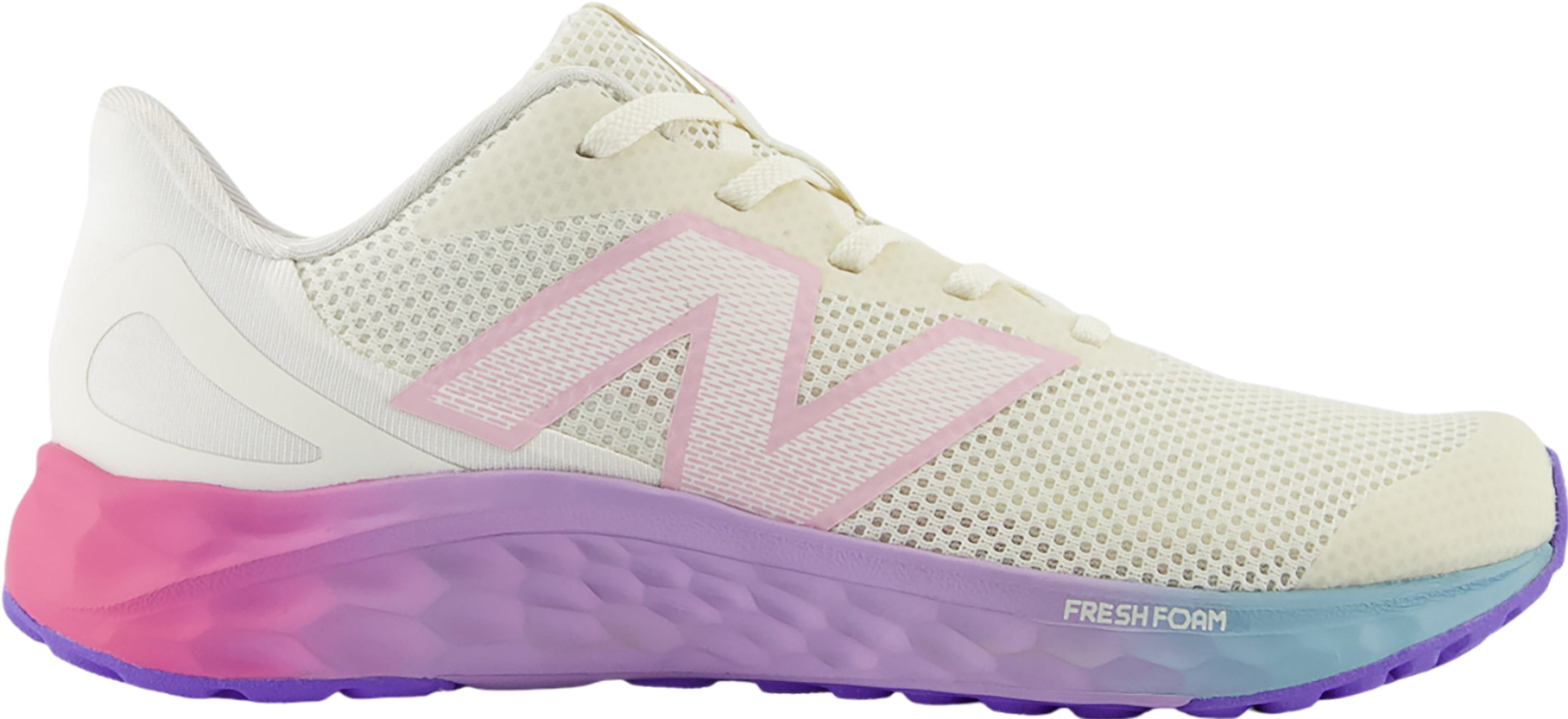 Features: • Fresh Foam midsole cushioning is precision engineered to deliver an ultra-cushioned, lightweight ride • Lightweight mesh upper • Upper features no-sew overlays for a sleek fit and feel • Fashionable rainbow midsole • Rubber outsole pods • Lace-up closure for a secure fit • No-sew tip for added durability where kids need it most