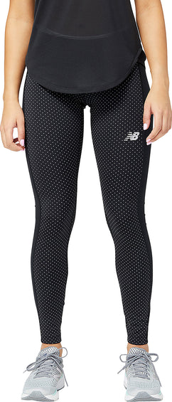 NB DRY technology wicks away moisture to help you feel dry and comfortable, and the fitted silhouette hugs your body for a snug fit with a range of motion. These versatile women's running tights are made from high-stretch polyester/spandex material and have drop-in waistband pockets to keep your keys or cards close. Reflective print on both lower legs is designed to catch the light.