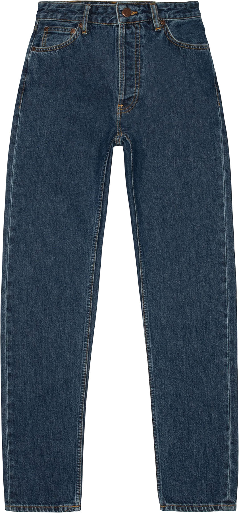 High-waist regular-fit jeans with a tapered leg in a soft, dark blue stonewash. The wash displays a wonderful blend of textures and muted dark indigo hues. Seams provide a highlighting detail, and a subtle marbling texture adds depth and further detail, giving this plain stonewash the authentic, deep indigo stonewashed look of the '00s.