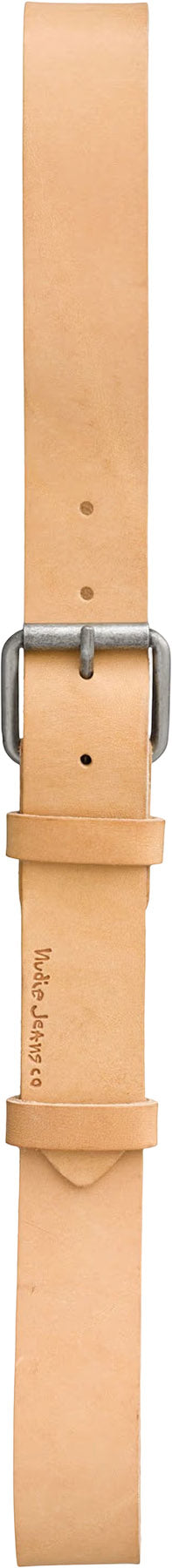 Belt made in vegetable-tanned full-grain leather with a debossed Nudie Jeans logo. Antique silver buckle.
