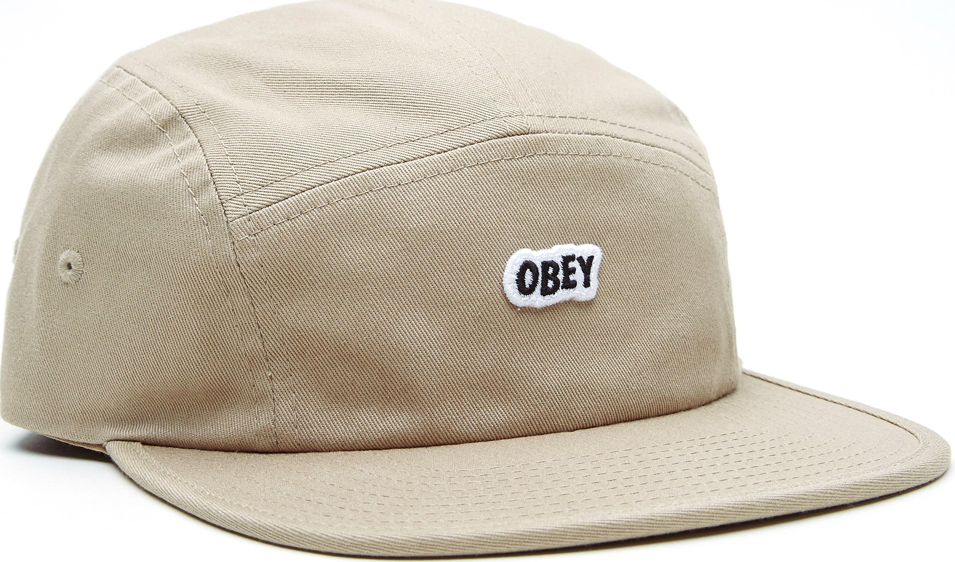 Unstructured 5 panel camp cap. Mid profile crown height with flat visor, logo embroidered patch and webbing strap with plastic clasp closure.