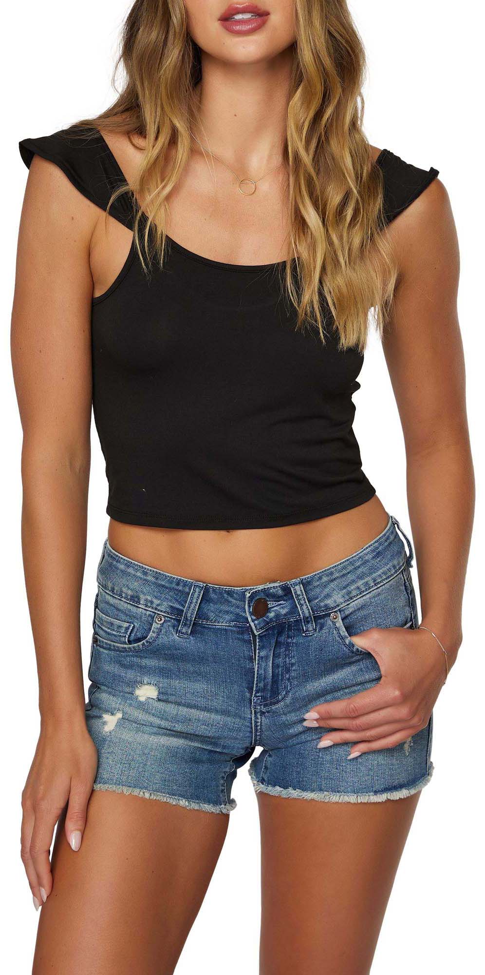 The perfect sunny day top to pair with your favorite skirt or jeans. It features a mini flutter sleeve design, solid color wash and skimmer length fit.