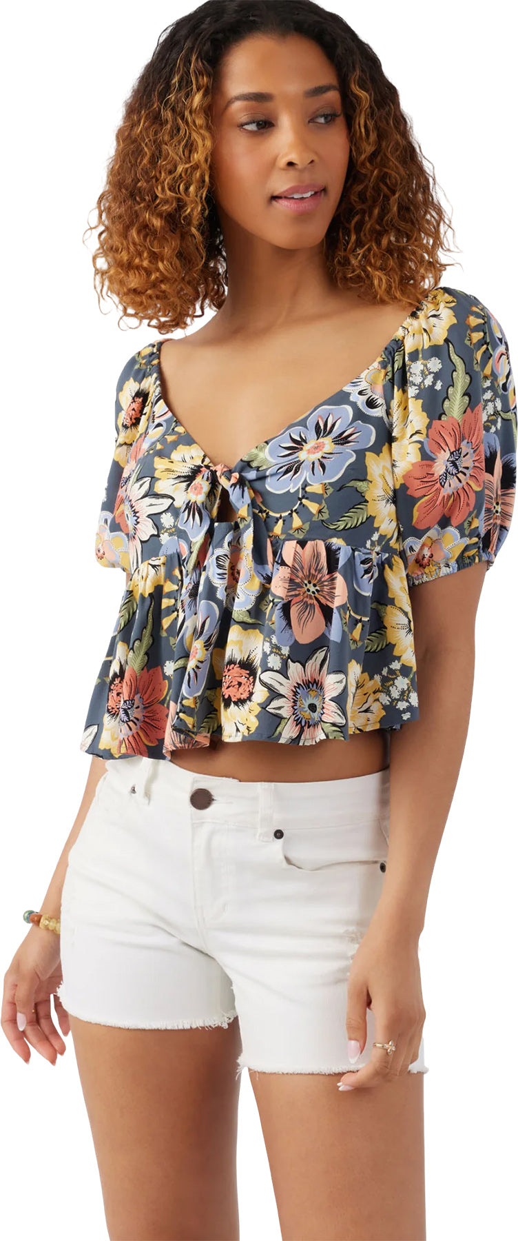 Features • Woven Top • Skim Length • Cf Tie With Cut Out • Encased Elastic Sleeves • Smocked Back • Flounce Hem • Puff sleeve detail with elastic • Allover print