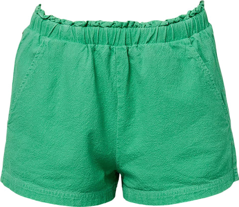 Effortlessly stylish woven short that features a solid color design, elastic waist with ruffle detail and comfortable fit.