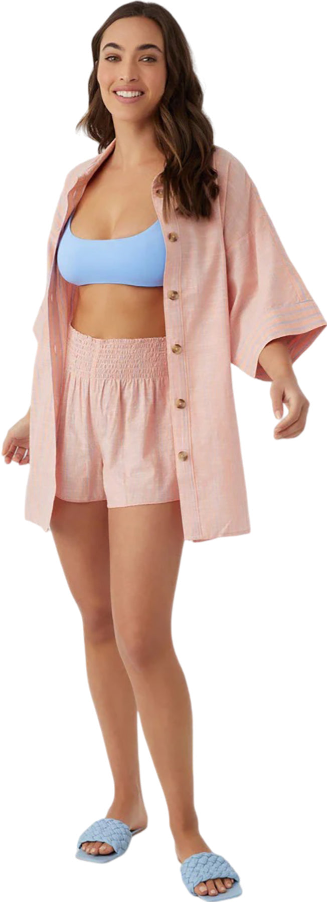 Light and flowy oversized top that has a front button design, side seam slits and allover print.