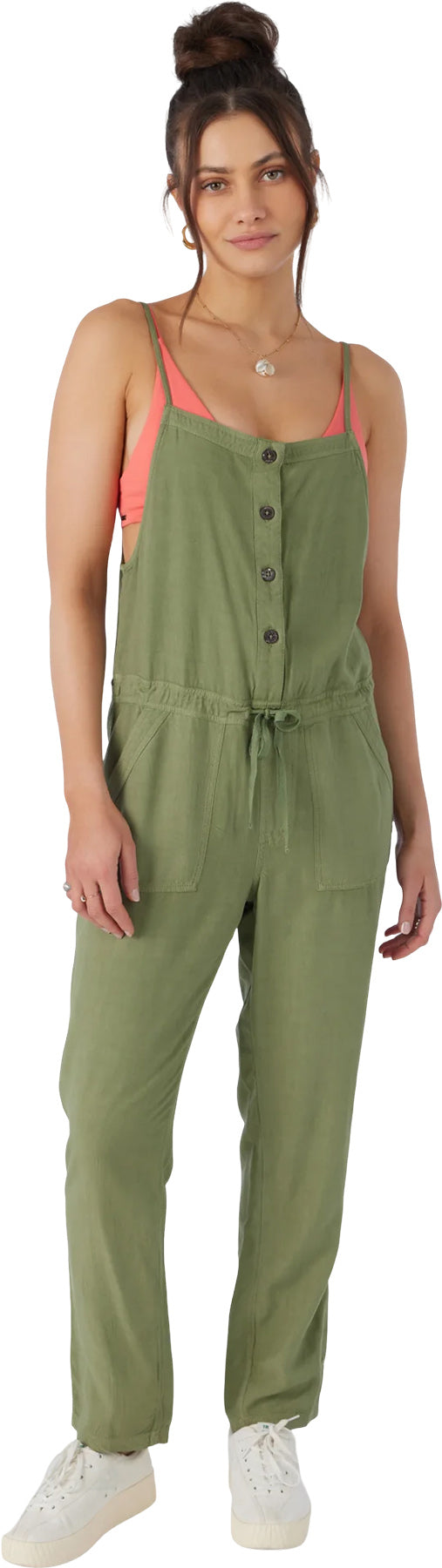 Laid-back woven jumper that features a front button design, over the shoulder straps and a straight leg fit.
