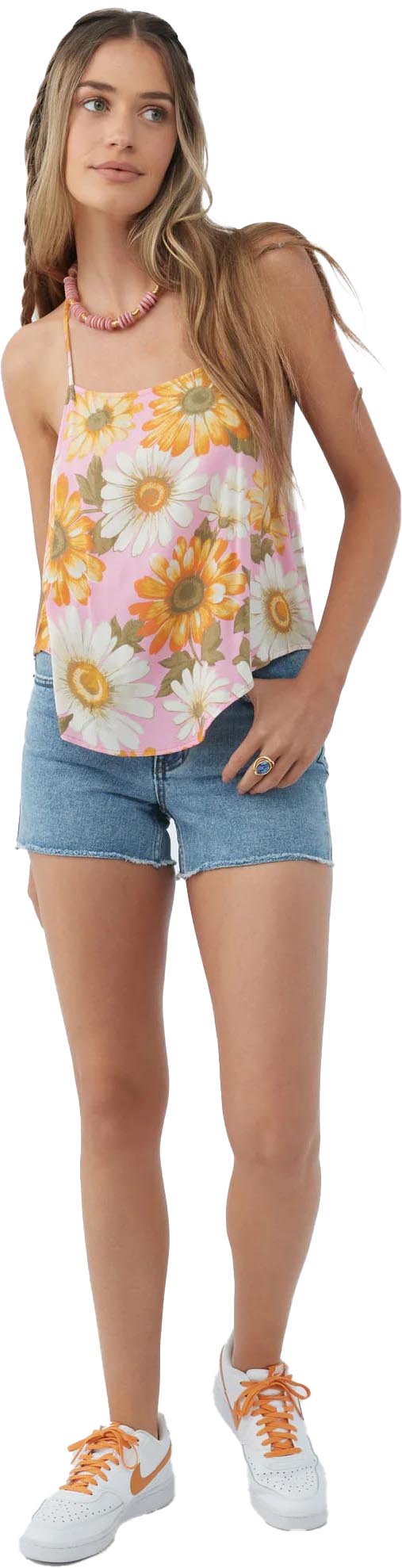 Radiate sunny vibes in this colorful woven tank. It has an allover print design and regular length fit.