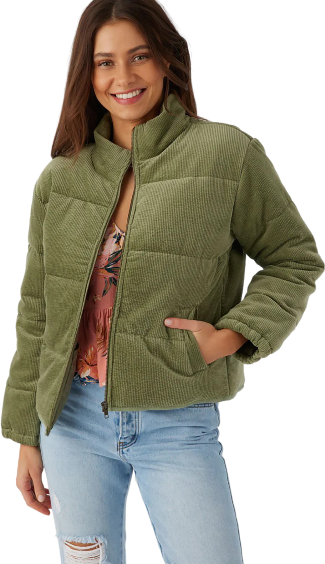 Stay warm when the weather gets cold in this cute and cozy jacket! It has a woven quilted corduroy design, high collar detail and is fully lined.