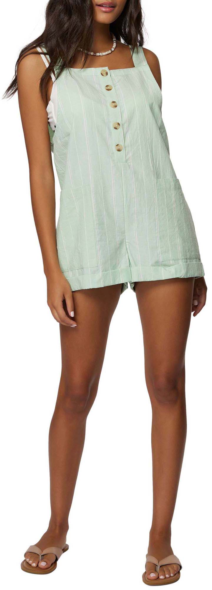 All-in-one tank romper that has a soft woven feel, front button design and adjustable over-the-shoulder straps.