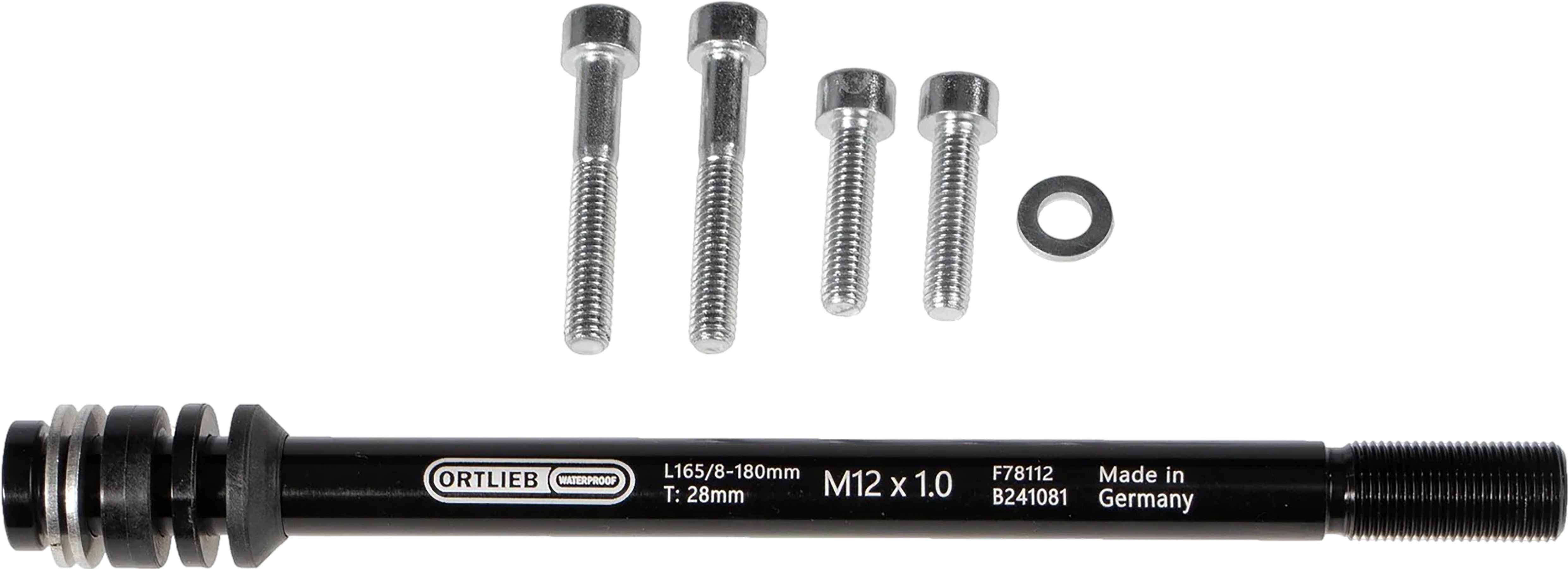 Adapter thru-axle for mounting luggage racks or trailers using the integrated M6 threads, can replace axles up to 180mm in length, making it highly versatile. The adapter thru-axle can be adjusted to the required length using the included spacers; it is available in three thread pitches.