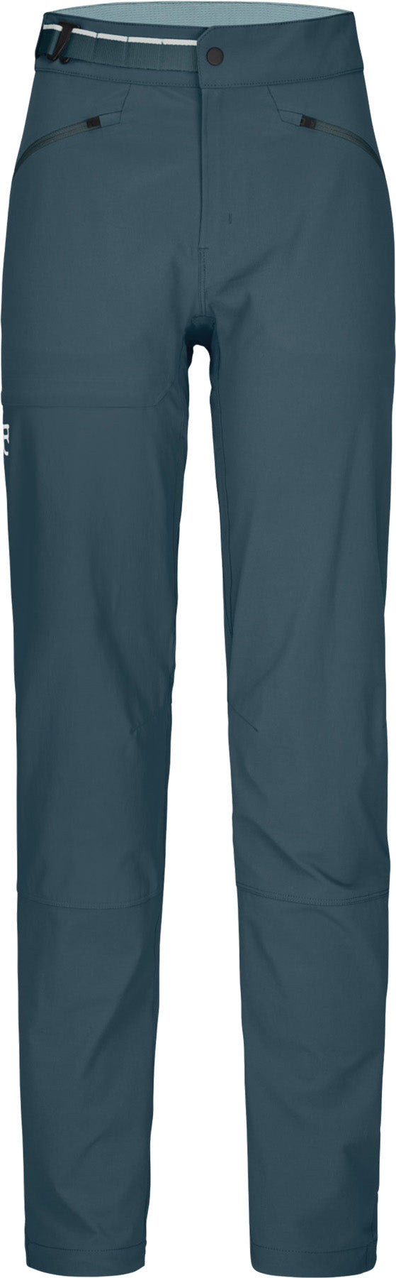 Developed for alpine adventures: The lightweight Brenta Pants for women mirror every movement and won’t shy away from contact with a rockface. The durable Shield Light material withstands more than 80,000 abrasion cycles in the Martindale test, making it one of Ortovox’s most robust fabrics. The elastic 4-way stretch material guarantees optimum freedom of movement in the mountains and is also breathable, water resistant and quick drying. Thanks to their new, loose cut and higher waistband, these pants have a modern, comfortable fit. A hook on the integrated belt allows it to be fastened in just one move, and there is no need to unfasten it when taking the pants off or putting them on. Two spacious front zipper pockets provide plenty of room for money or keys, while the thigh pocket has a hidden zipper and taped seams for additional storage room and a clean look. Merino mesh inserts in the waistband and pocket areas provide added comfort. The Brenta Pants for women are PFC-free and climate neutral.