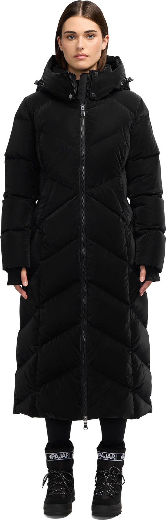 Women's Inverted Chevron Quilted Maxi Puffer: Temperature rated for -20°C, blending style with functionality. Boasting a removable hood with jacquard logo tape and bungee hood adjustments, welt hand pockets and snug rib knit storm cuffs for added protection from the elements.