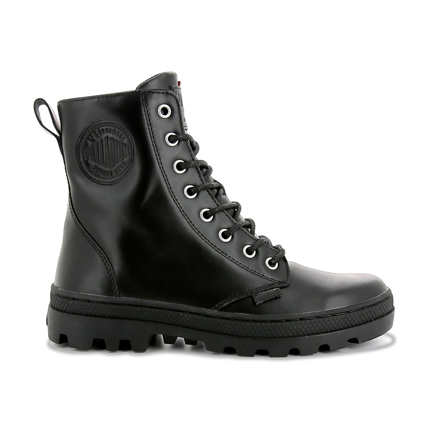 The women’s Pallabosse Off Lea Boots by Palladium are military-inspired footwear with a striking silhouette for the modern urban explorer. They feature smooth leather uppers that rest at a higher height to evoke the same look as an officer’s shoe. Twill linings pair well with socks, while the stitched and cemented rubber outsoles deliver lugged traction on city sidewalks. The eight shoelace holes can be pulled tight for a streamlined look.