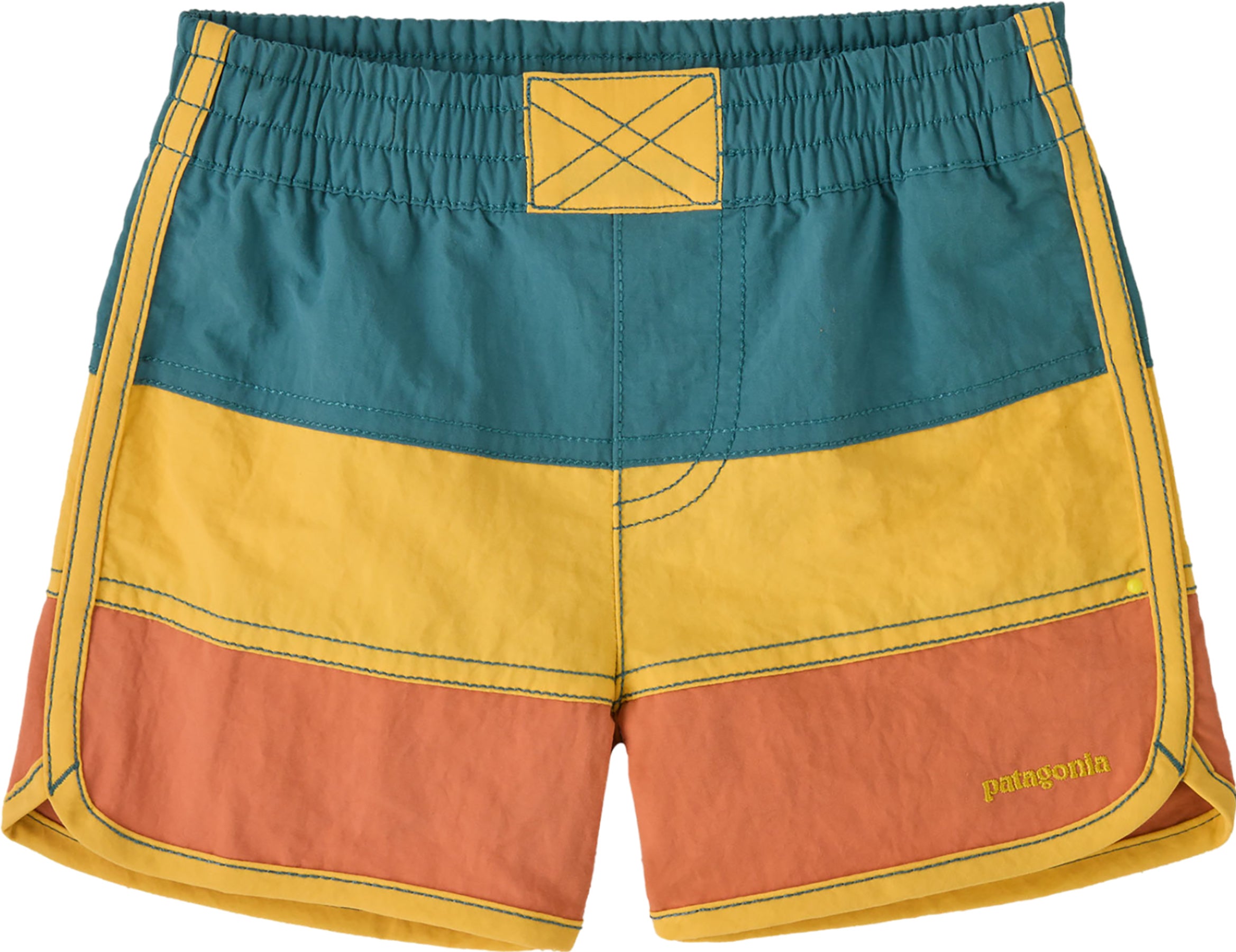 Our fun, color-blocked, baby-sized boardshorts are made of quick-drying fabric for comfort in and out of the water, and they have a soft elasticized waistband for easy on/off. The lightweight NetPlus® 100% postconsumer recycled nylon faille is made from recycled fishing nets to help reduce ocean plastic pollution; with a PFC-free DWR finish (durable water repellent coating that does not contain perfluorinated chemicals).