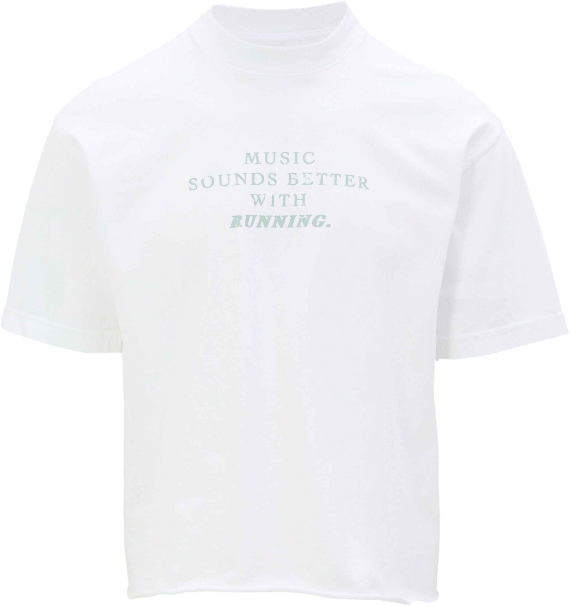 Jersey T-shirt with mineral wash for extra soft fabric feel. Hand dyed for a unique colour. Rib to avoid flare at neck. Centered print reads, Music Sounds Better with Running.
