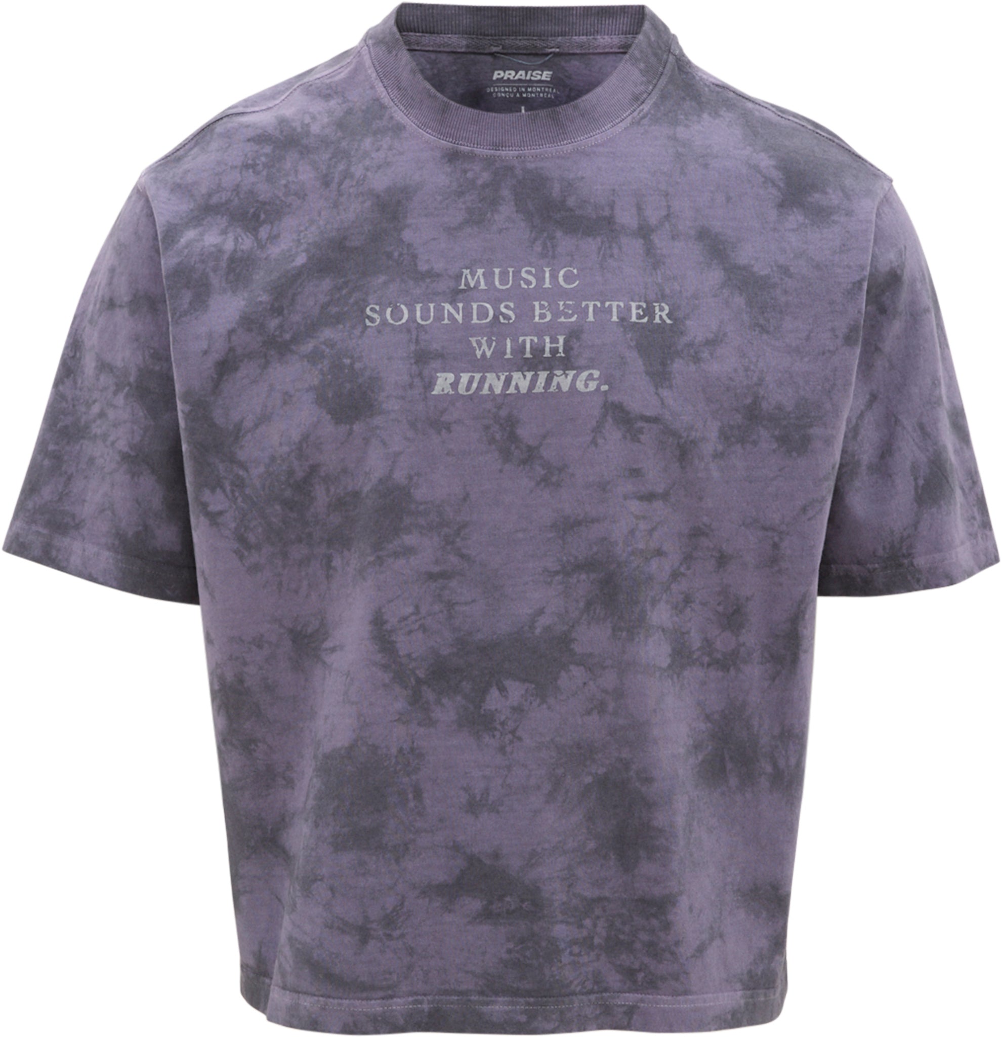 The Greta T-Shirt is a jersey T-shirt with mineral wash for extra soft fabric feel. It is hand-dyed for a unique colour. The ribbed collar avoids flaring and the centered print reads, "Music Sounds Better with Running".