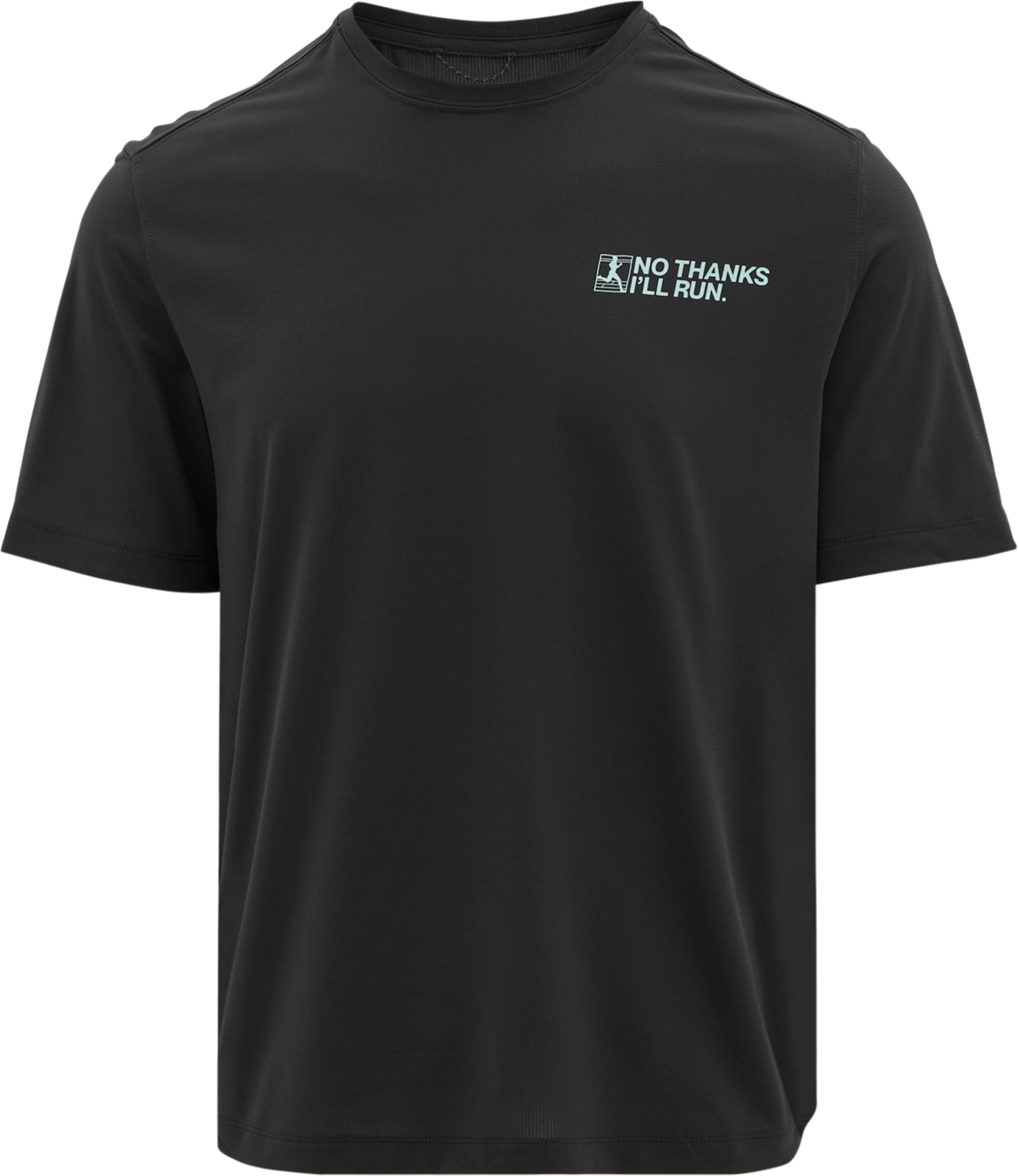 Lightweight, breathable and moisture wicking synthetic jersey fabric to make a premium running t shirt. Rib to avoid flare at neck. Slogan on front that reads, No Thanks I'll Run.