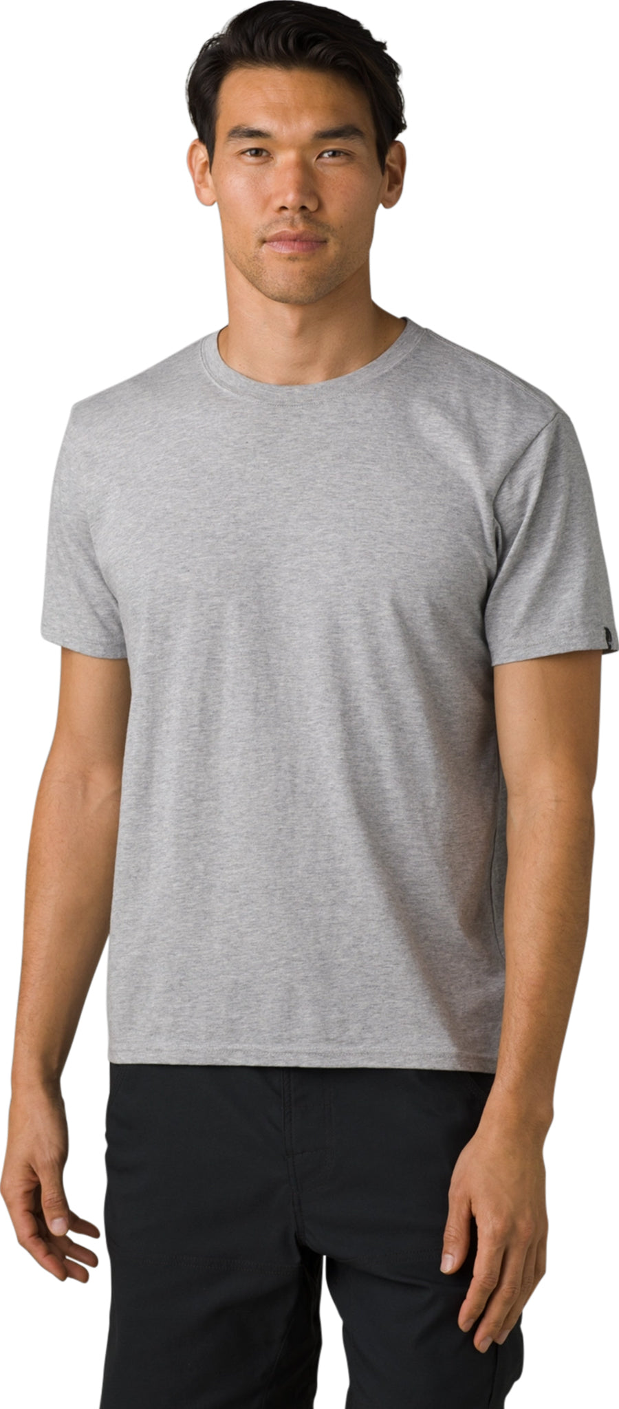 • prAna crew neck basic tee with a woven label on wearer's left sleeve
