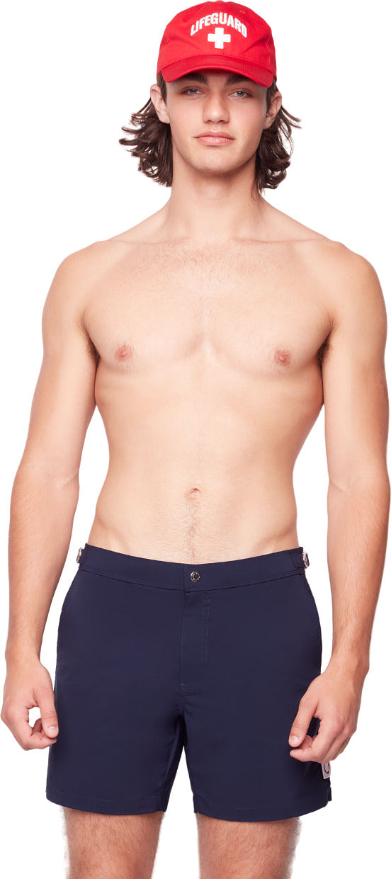The Lifeguard swimming trunks are cut slim in a flattering mid-thigh length. They’re crafted from fast-drying stretch fabric with quick-dry technology and lined with anti-chafe compression shorts for all-day comfort. A zippered back pocket keeps valuables securely in place, while the seamless stretch waistband is finished with a zip fly, snap closure and adjustable side tabs for a trouser-like fit that will keep up with your active lifestyle. Pair them with a fresh white tee or your favourite button-down for a polished, post-swim look.