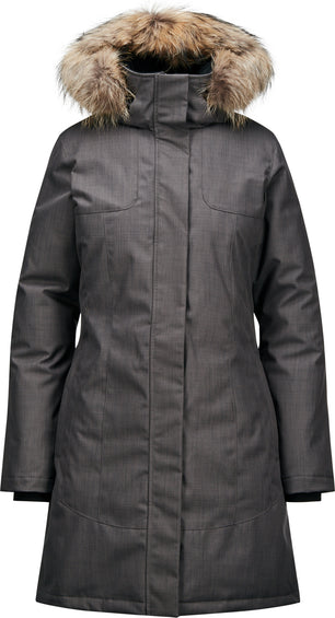 Debuting in 2009, the KIMBERLY has become a classic women's parka. It obtains its warmth from a plush padding of Quartz.Co's ethically-sourced 650 fill power Canadian White Duck Down. This parka has a semi-slim fit to a mid-thigh length, enhancing your figure while still allowing maneuverability through your arms and upper torso. The outer fabric is Herringbone polyester twill, woven for wind-resistance, moisture evacuation, and treated with an eco-friendly DWR finish from C6 Technology. Along the heritage-style adjustable and fully detachable hood, the coat is furnished with a removable trim of Finnish raccoon fur. The elegantly understated exterior and fur trim make the Kimberly ideal for winter cities, providing it with the looks and warmth for activities like ice skating along the Ottawa canal.