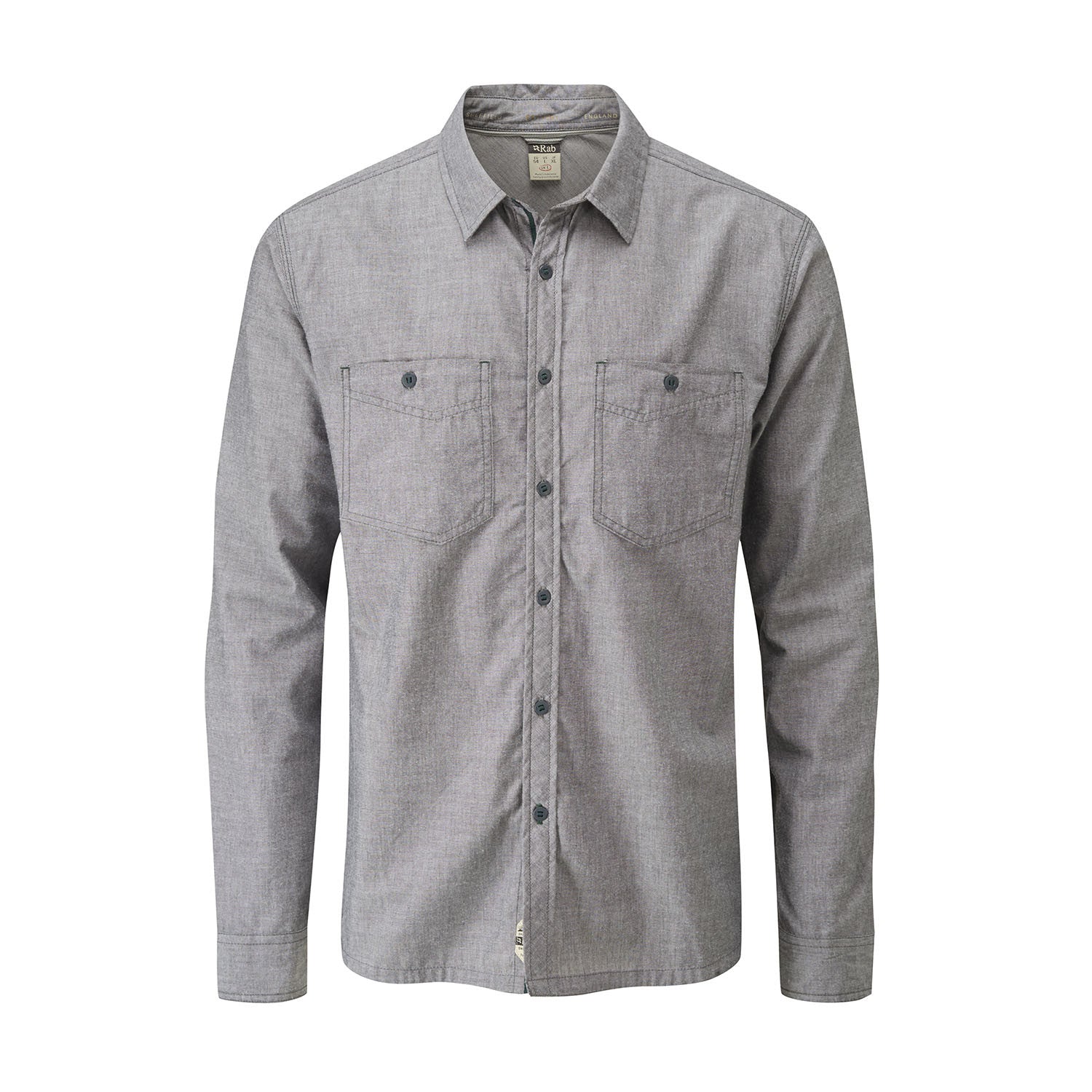 Features • Cotton/Polyester outer with wicking finish • Full button placket with shirt collar • Rab® branded buttons • 2 chest pocket with button closure • Rab® woven labels • Escape range ID label • Triple stitch detailing