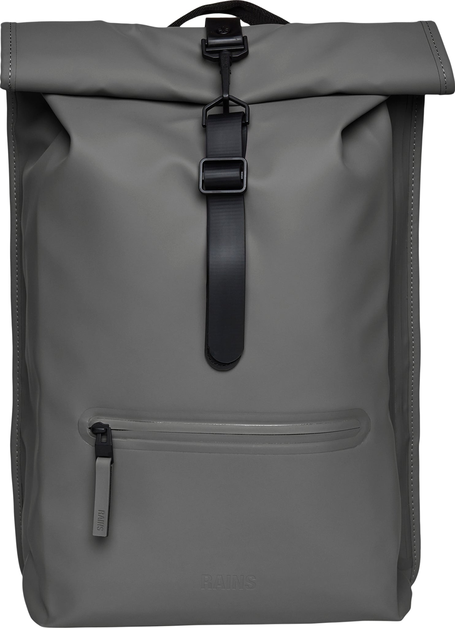 Rolltop Rucksack is a city staple, perfect for commutes on bike or foot. The look is characterized by a tactile strap, signature carabiner and rolltop opening. The waterproof bag also features a side-access laptop pocket, front zip pocket and padded back panel. Cycle-ready features include a front D-ring – ideal for holding bike locks – and a buckle fastened chest strap for a secure ride-proof fit. Rolltop Rucksack is cut in Rains’ signature waterproof PU fabric, engineered for carrying strength, durability, and a smooth feel.