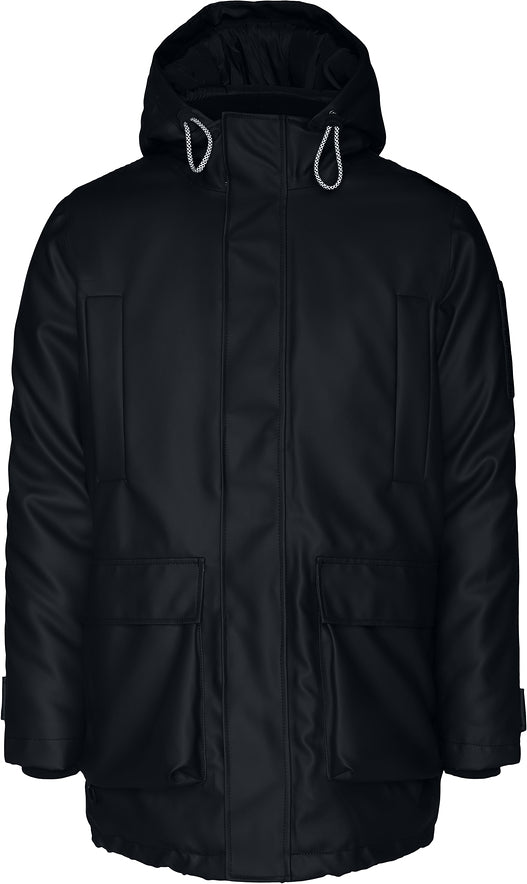 The Glacial Parka is a winter outerwear piece utilizing signature design elements inspired from workwear archives. Glacial Parka has a boxy silhouette that stops at mid-thigh and features a drawstring hood. Fleece-lined cargo and side pockets are paired with hidden ribbed cuffs to better bear against frigid temperatures. Outerwear from Rains’ Glacial series utilizes a thick and durable twill fabric, waxed in a waterproof PU. Each piece is heavily padded to enclose the wearers’ body for protection against the cold. Multi-colored climber strings are utilized across the body to adjust fit for comfort and preference. Durable Velcro blocks ensure a secured closure of the wide placket, blocking wind and winter elements from penetrating. Signature to Glacial are Velcro patches on the left arm.