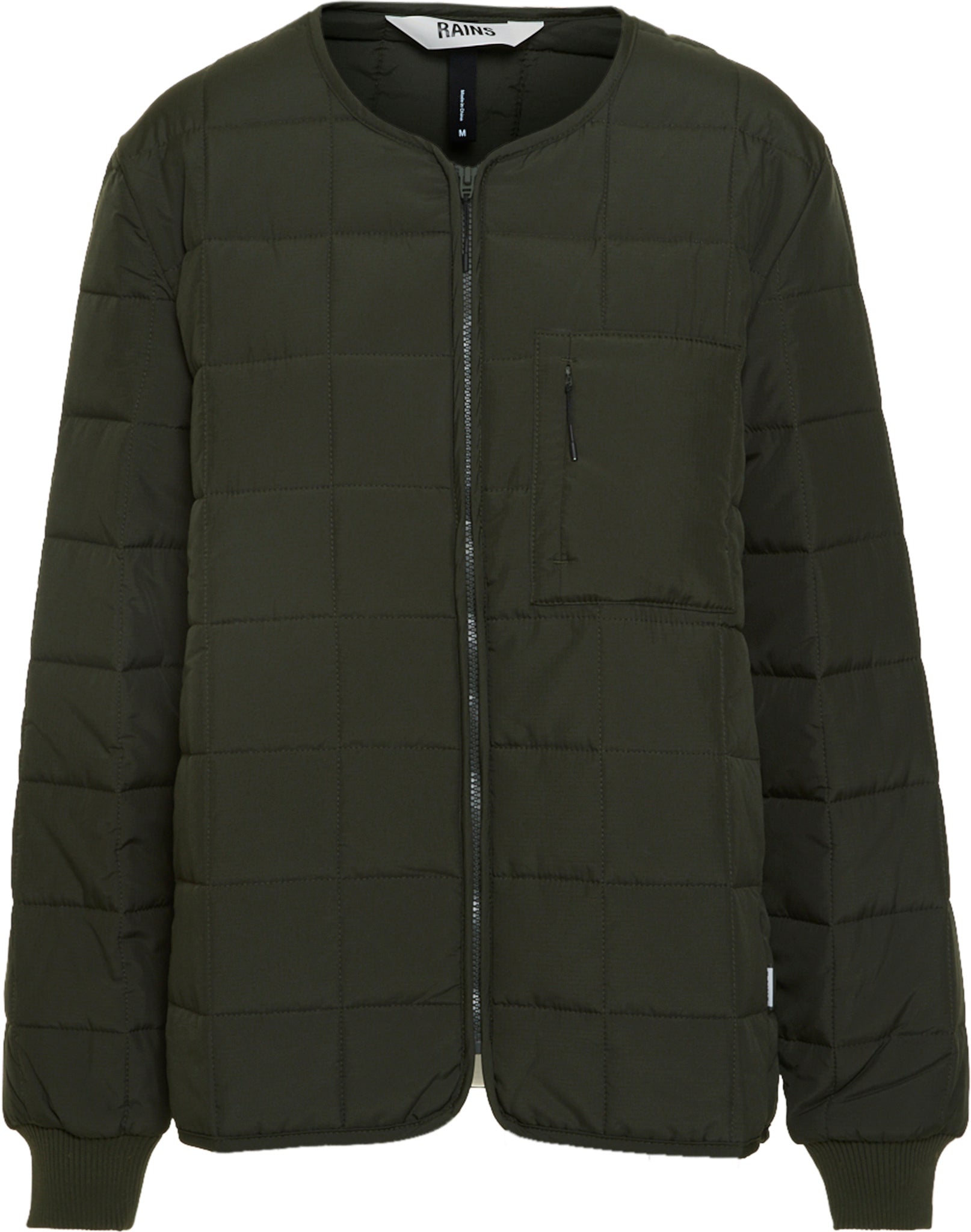 The water-repellent quilted jacket can be attached to designs from the Rains' Essential rainwear collection via its signature back mounted TPU strap. Liner Jacket features an O-neck, chest pocket with concealed zip, and concealed side pockets. The design is cut from a ripstop polyester, developed to be soft yet durable, water-repellent, and breathable.