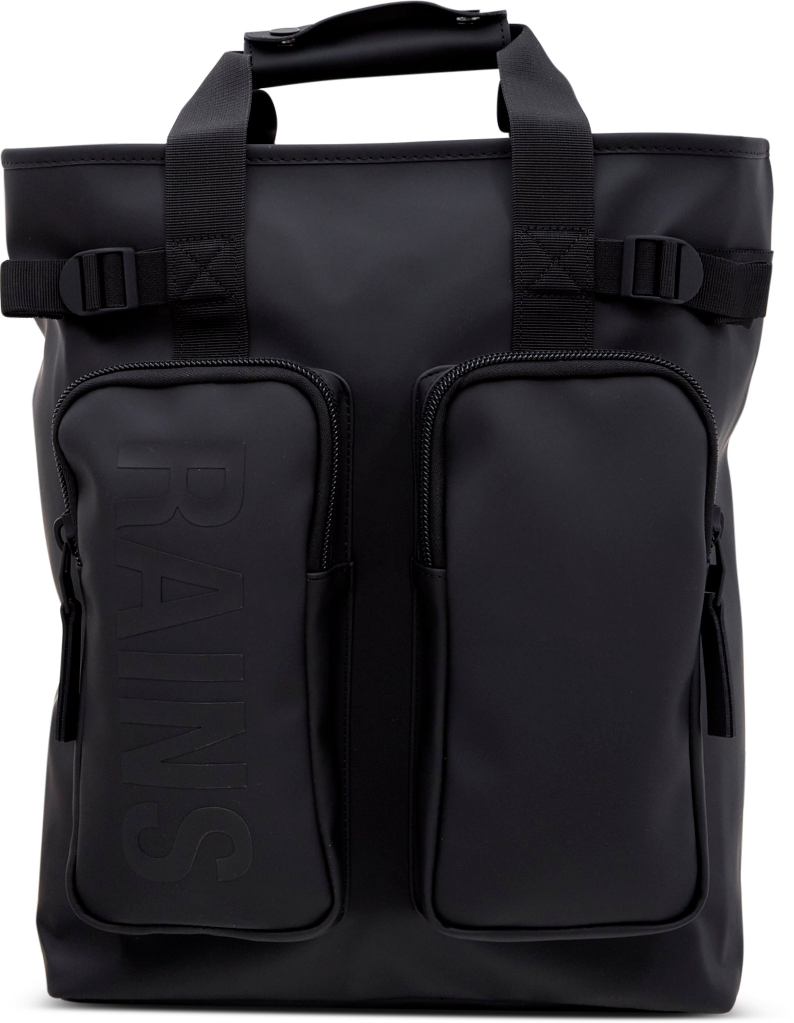 Texel Tote Backpack is a hybrid utility bag with a padded laptop sleeve designed for short travels. It is cut from waterproof PU fabric, designed to repel rain. Texel Tote Backpack doubles as a waterproof tote and backpack, worn via adjustable padded shoulder straps. Unzip the bag to reveal a spacious main compartment with mesh and zip pockets and a padded laptop sleeve for 15” laptops. On the outside, two front utility pockets are ideal for passports, chargers, and other small items. The design is finished with webbing carry handles and side compression straps. A back-mounted trolley sleeve, with zip pocket, allows the bag to be slid onto telescopic trolley handles for easy transportation. Design is finished off with a padded mesh back panel for comfort. Texel Tote Backpack is cut from Rains’ signature waterproof PU fabric, engineered for carrying strength, durability, and a smooth feel. Sized to fit Texel Cabin Trolley and Texel Cabin Bag. May not fit trolley bags from other manufacturers.