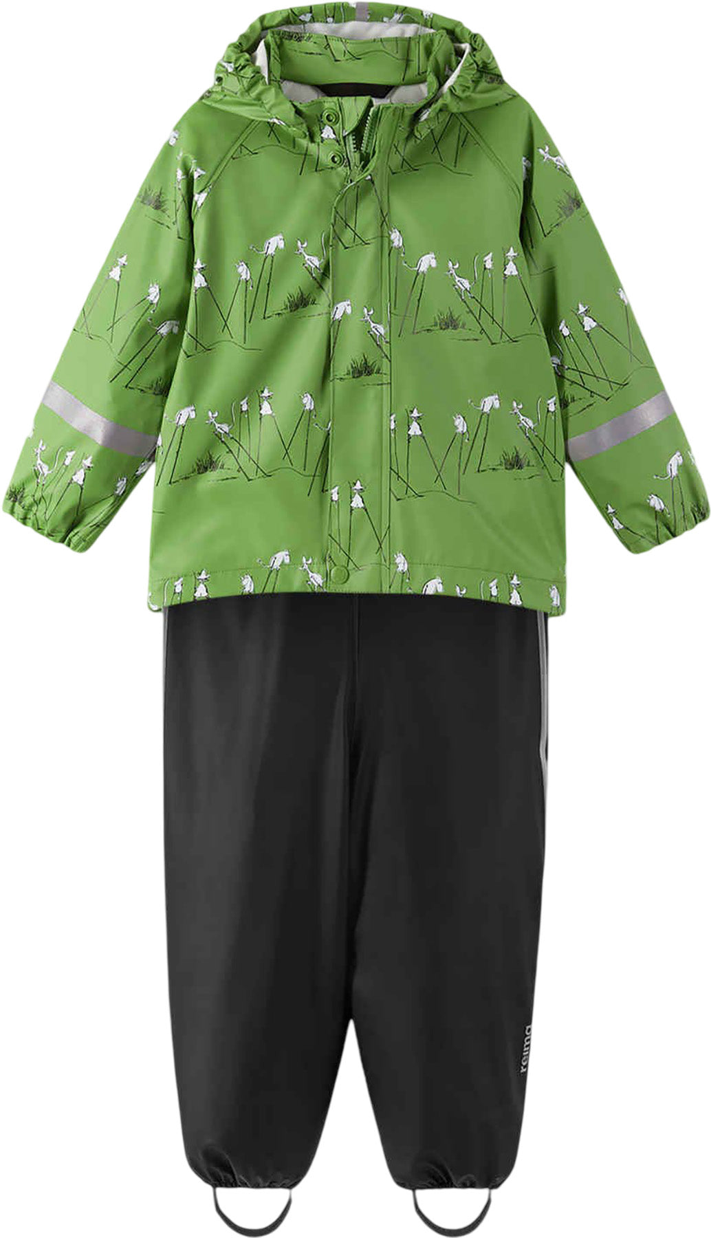 This unlined toddlers' Moomin theme rain outfit is great for wet days in spring and autumn. When you add warm layers underneath, it'll protect little ones even during the chilliest weather. Welded, waterproof seams guarantee that no rain comes through to your little one's skin under this kids' waterproof suit. The detachable hood not only protects from drizzle but also safely comes off if it gets caught on something when children are playing outdoors. The pants stay up thanks to the elasticated, adjustable suspenders and the removable foot loops are easy to pop under rubber boots or waterproof trainers to keep hems in place. All Reima children's rain gear is made from a flexible, PVC-free material.