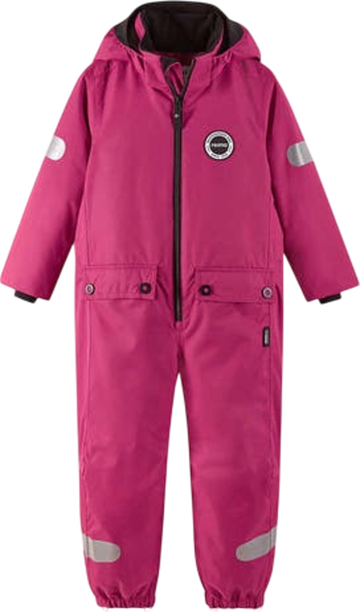 This mid-season kids' waterproof outdoor jumpsuit draws its inspiration from Reima collections of the 1970s. All the seams are sealed waterproof, and the partly recycled material is dirt-and water-repellent. The smooth, lightly insulated lining makes dressing easy. The detachable hood is safe-attached with snap buttons, it comes off easily if it gets caught on something. The waist can be adjusted from the inside and the foot loops keeps the pants hems in place. Two flap pockets and big reflective details finish off the retro look!