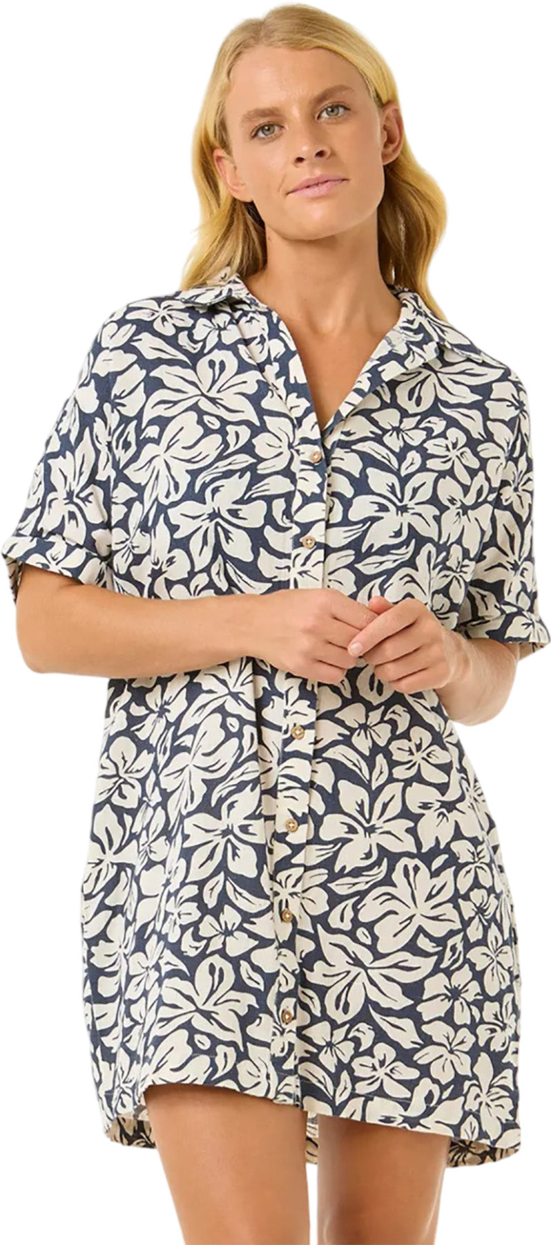 The Las Dalias Short Sleeve Shirt Dress offers breathable cotton-linen, side pockets, and button-through detail. A relaxed fit for everyday wear, from surf checks to casual catch-ups.