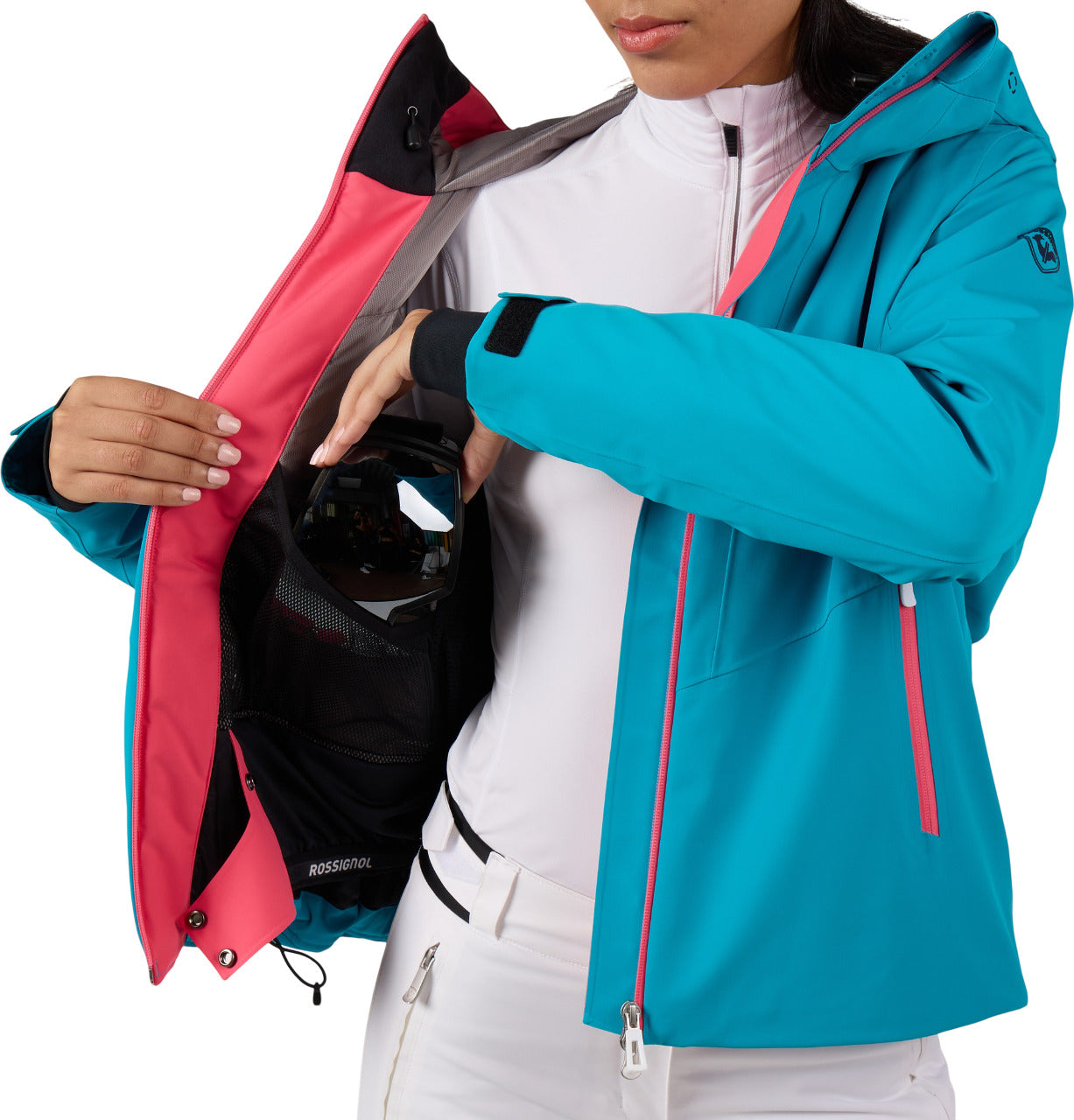 High-performance storm coverage with an elevated fit and feel to match active skiing. The women's Rossignol Blackside Ski Jacket combines the easy-moving feel of four-way stretch with the latest waterproof, breathable technology to match fast-paced days on the mountain. Low-profile synthetic insulation turns up the heat on cold lift rides, while fully-taped seams enhance storm protection to keep you dry and comfortable through stormy weather. Ski day details like stretch cuffs with thumb loops, an attached goggle cloth and a built-in powder skirt extend your comfort range on cold days. The removable hood lets you customize your look and Rossignol's signature rooster reflects our century-old alpine legacy.